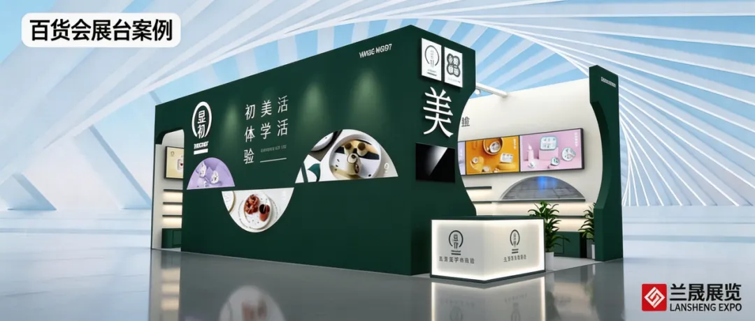 72㎡属于中型展位,空间灵活。我们根据企业需求灵活布局,以某百货展72㎡展台为例,兰晟展览以深邃绿色为主基调,搭配灵动拱门元素,既界定了空间,又凸显品牌标识,实现品牌信息有效传递。