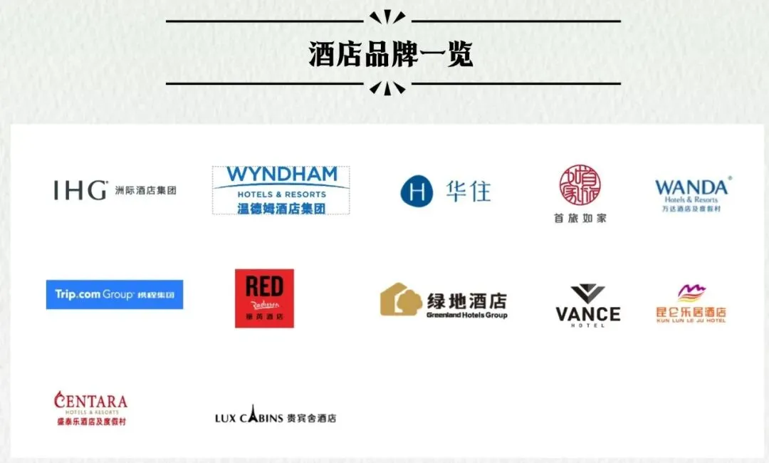 洲际、希尔顿、温德姆、华住、万达、万斯、丽芮、元开、贵宾舍、昆仑乐居、盛泰乐、阿迪纳兰、绿岛风、LHC 良合创想、惠达、艾格木、龙胜、西蒙、河东、乔山,奥力来,声博士,新青人,安心、舒华……