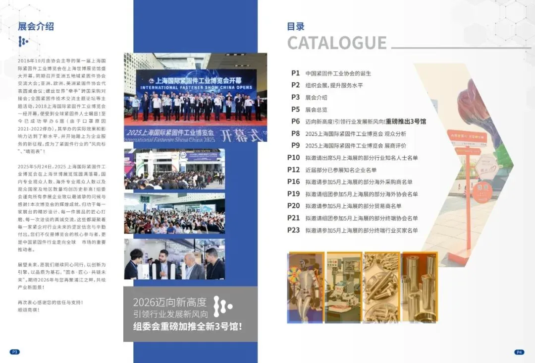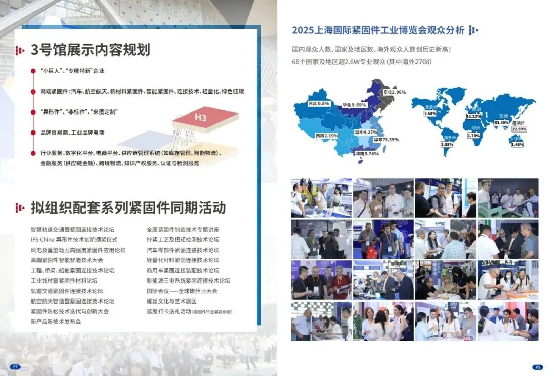 3. 3号馆(17000㎡,全新推出):定位紧固件前沿技术·高端紧固件·智能“智”造品牌馆,展商聚焦高端、智能、前沿技术、碳中和、绿色环保、新质生产力等方向;展品含高端/智能紧固件、异形件/非标件/来图定制产品、紧固件前沿技术,同时配套创新服务与技术论坛;展位采用光地特装及改良升级标摊,打造高附加值差异化展区。