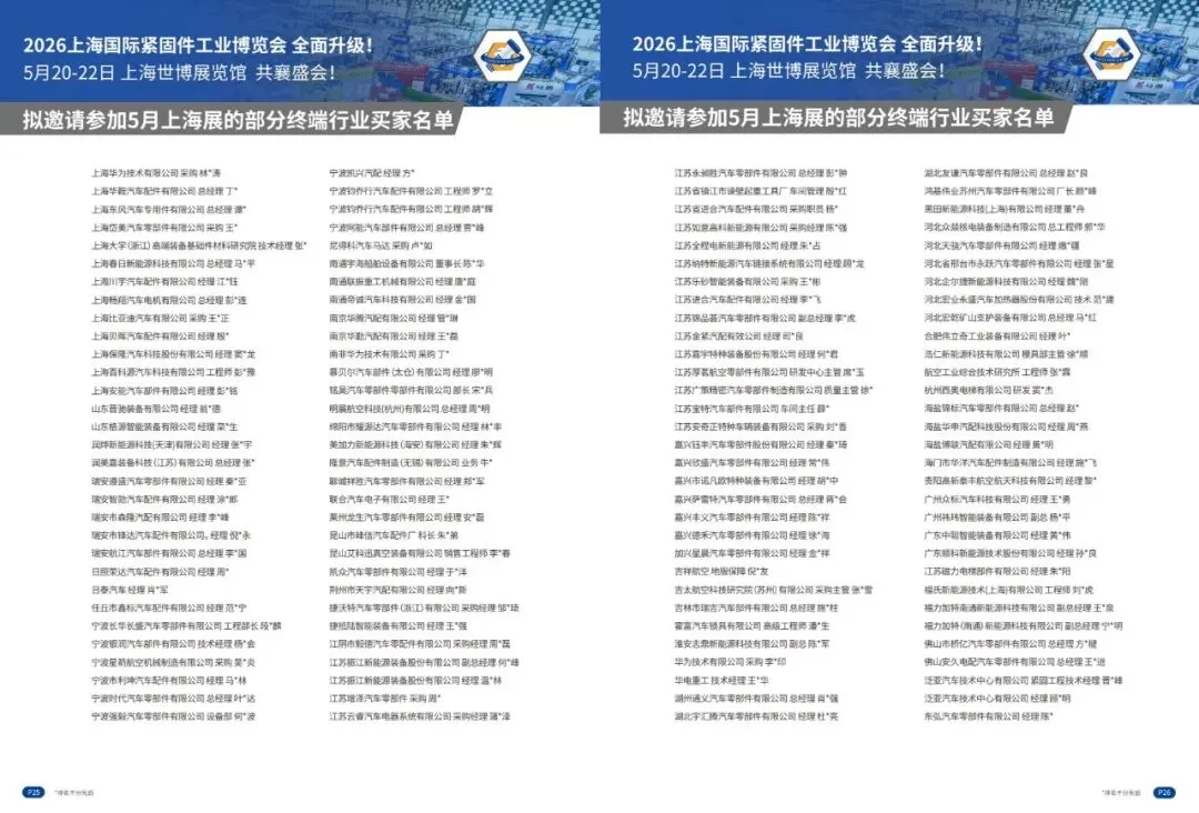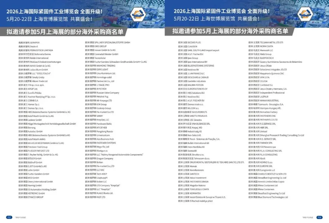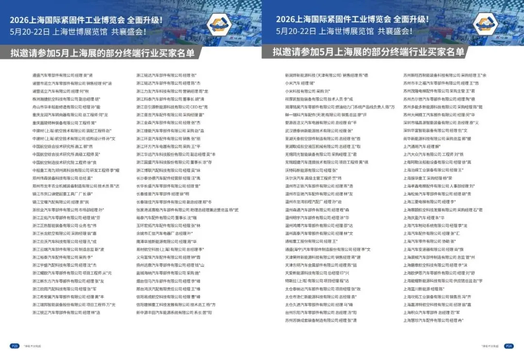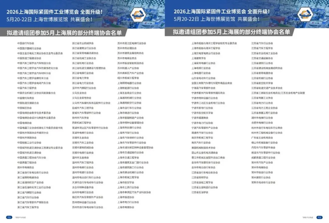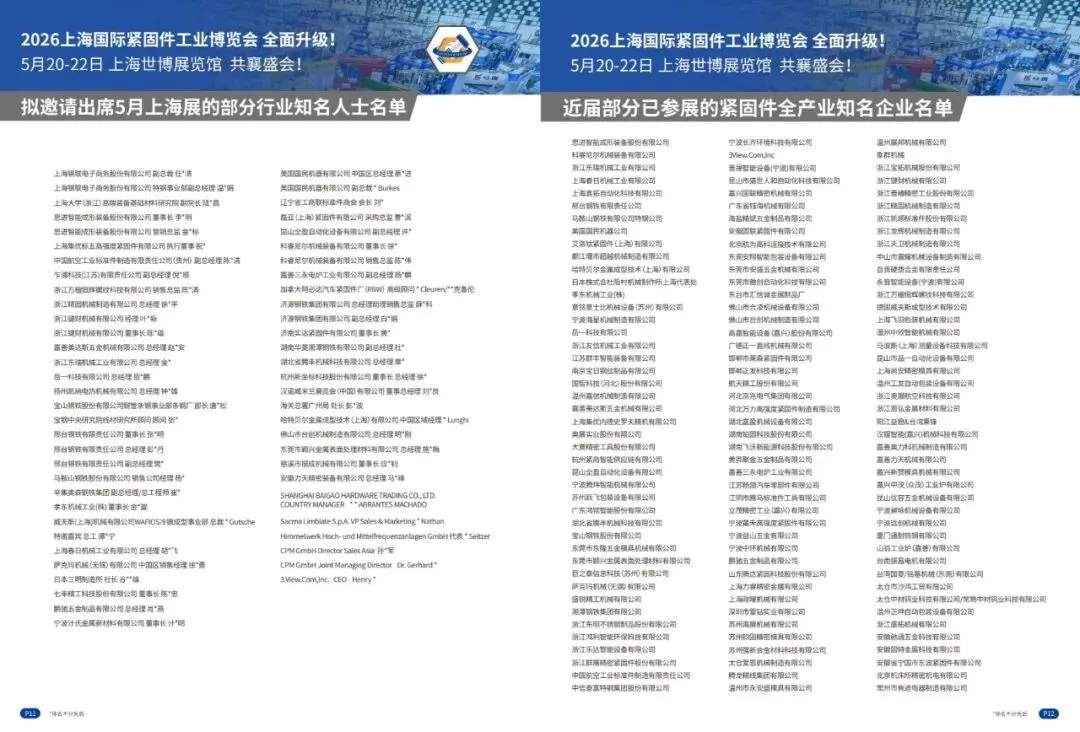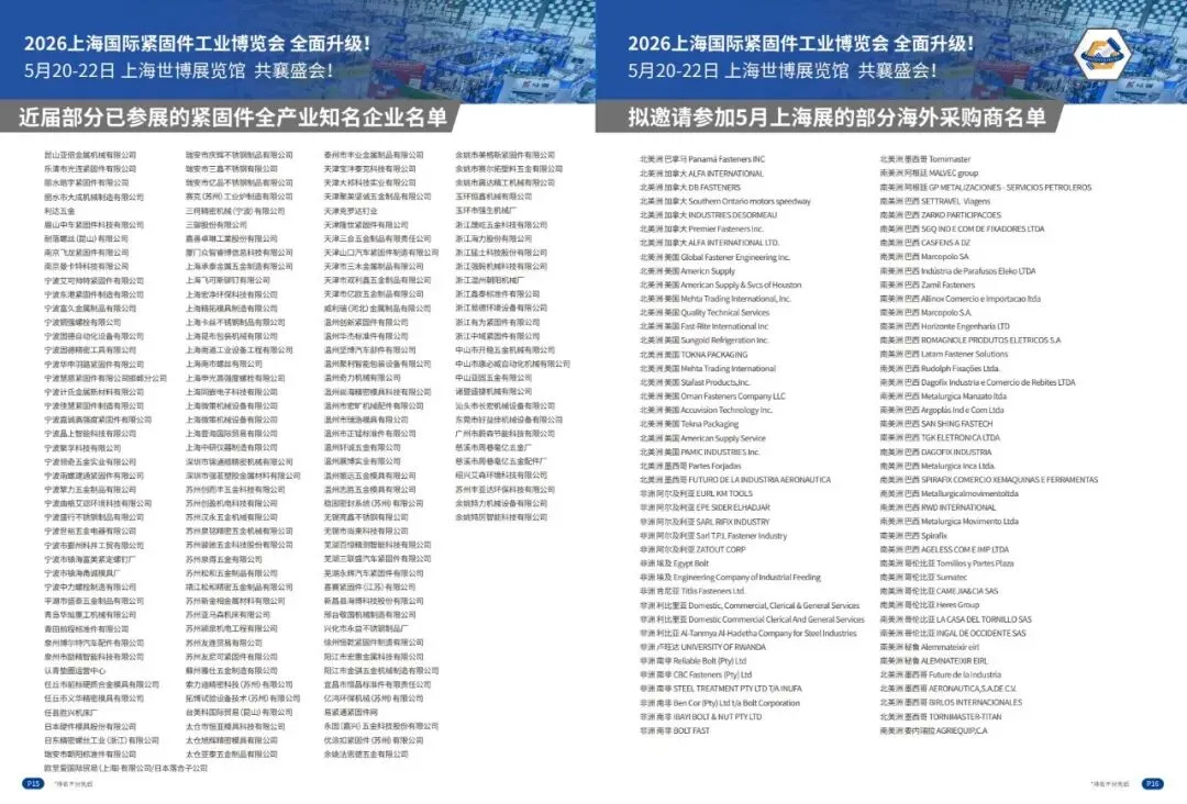 2. 2号馆(17000㎡):主打紧固件成品及生产应用,展品有标准/非标紧固件、汽车/航空航天/建筑/军工等行业专用紧固件、冲压件/车床件、工具/装配安装及维修设备等。