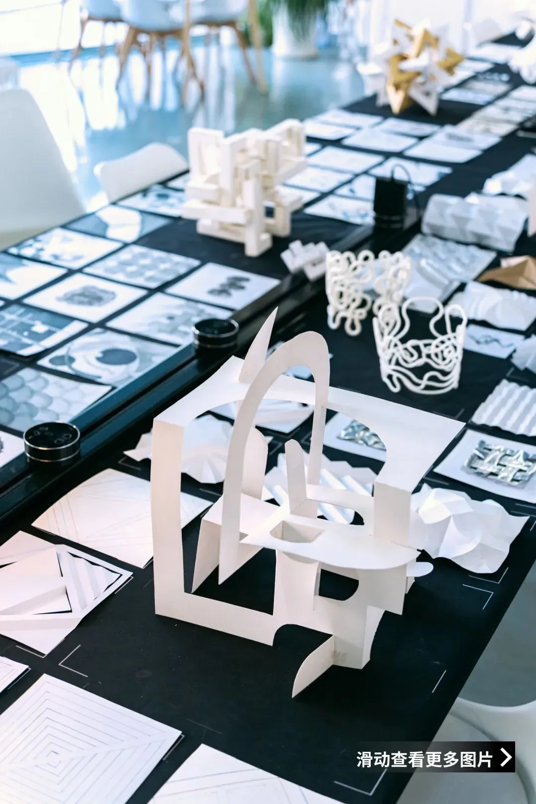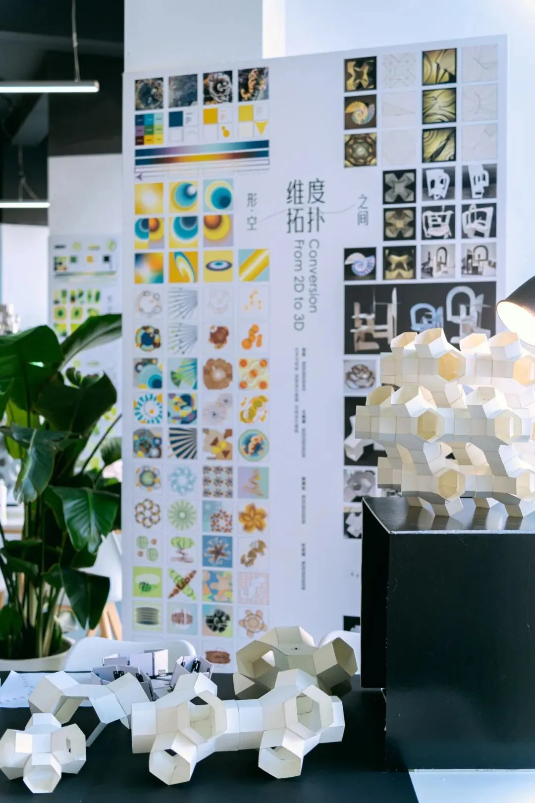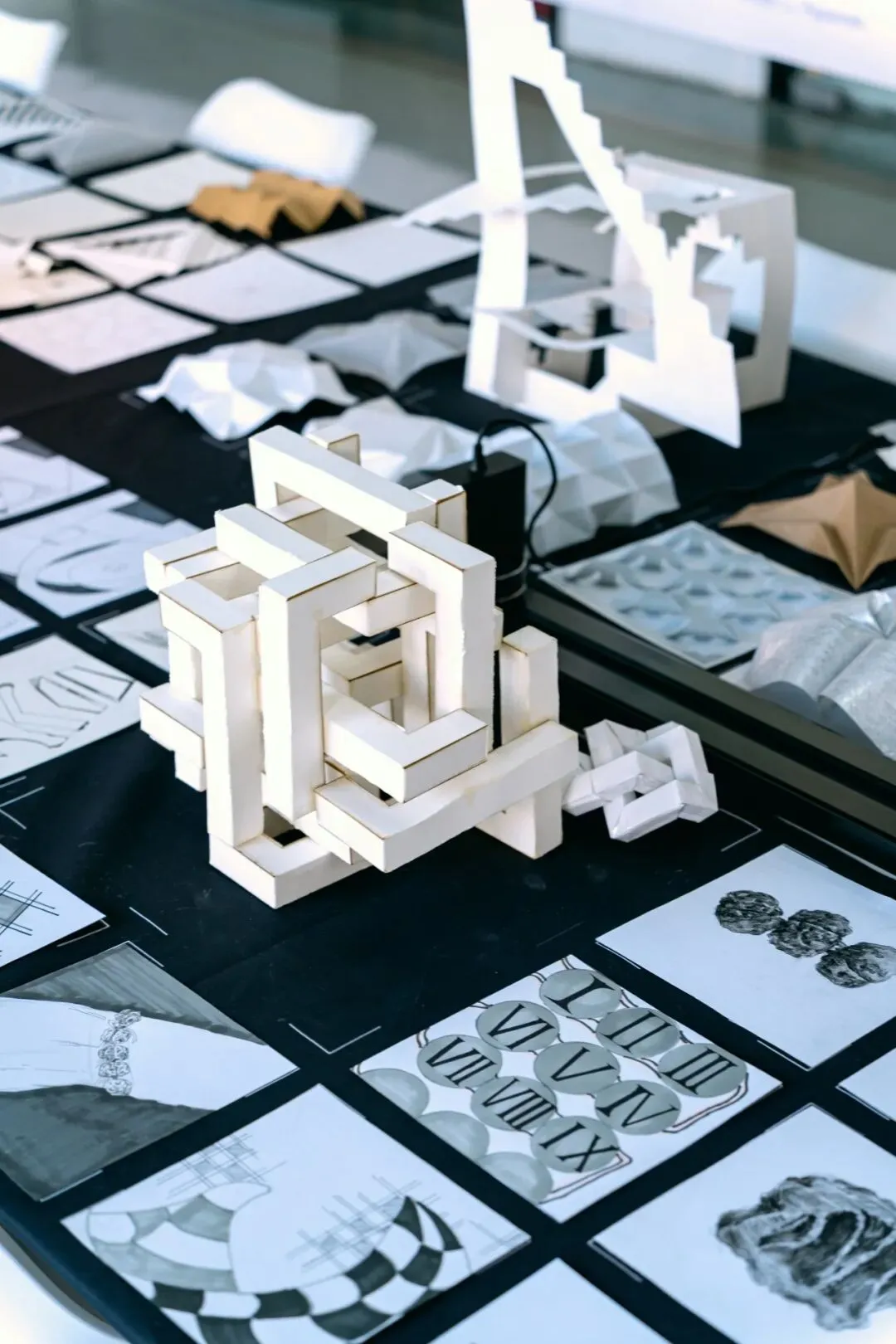 在“不改变纸张整体结构”的限制下,同学们通过精密的计算与多维度的翻折、穿插,让单薄的纸面在光影中立起,形成错综复杂、结构精巧的多维立体模型,训练了的基础的空间逻辑与动手能力。