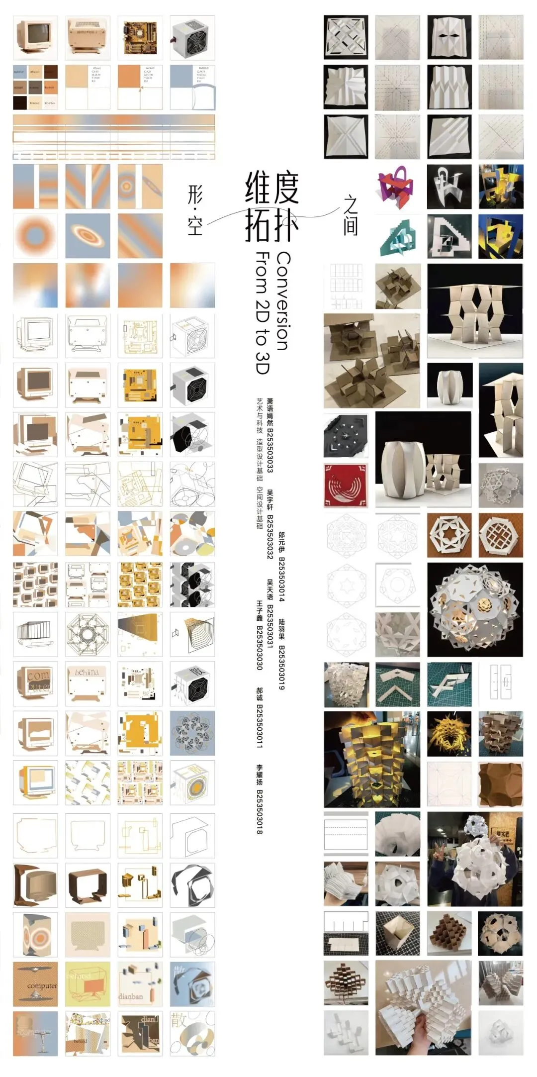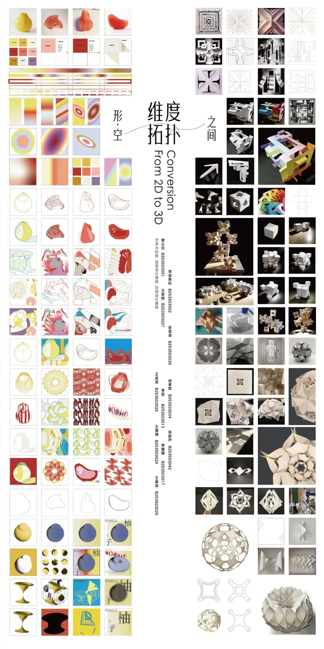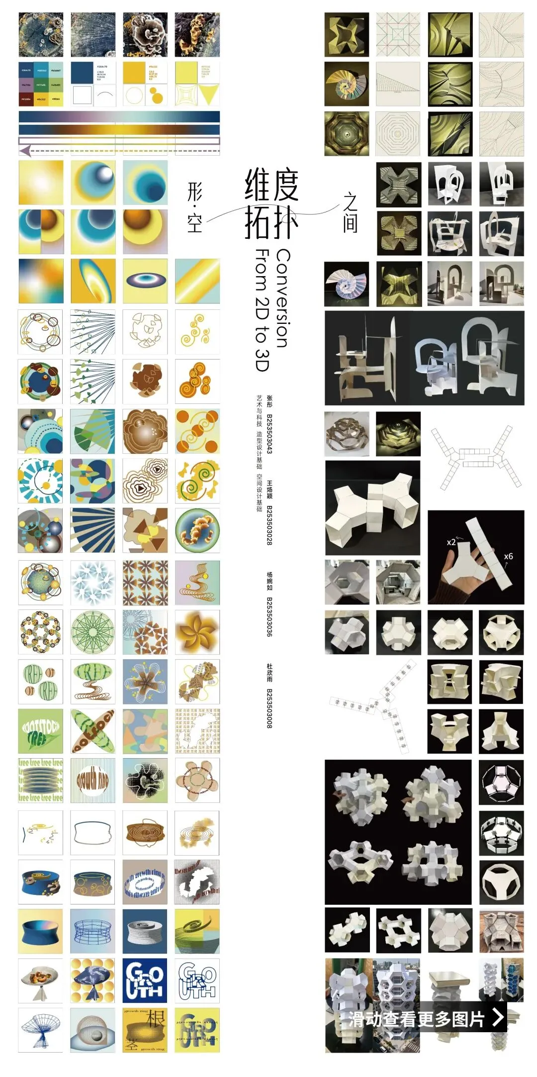 从平面构成的经络/骨骼概括,到二维纸张上的折痕处理,最终完成向三维空间的跃升。没有繁复的材料堆砌,只有最克制的表达。同学们在“不破不立”的哲学中,在不改变一张纸完整性的前提下,通过剪裁、折叠、弯曲、穿插,打破了纸张二维平面的宿命,最终在空间的折叠中,完成了从平面向三维立体解构的跨越。这不仅是对材料物理属性的试探,更是对“形”与“空”辩证关系的哲学思辨。当纸张脱离平面,设计的维度也随之打开。
