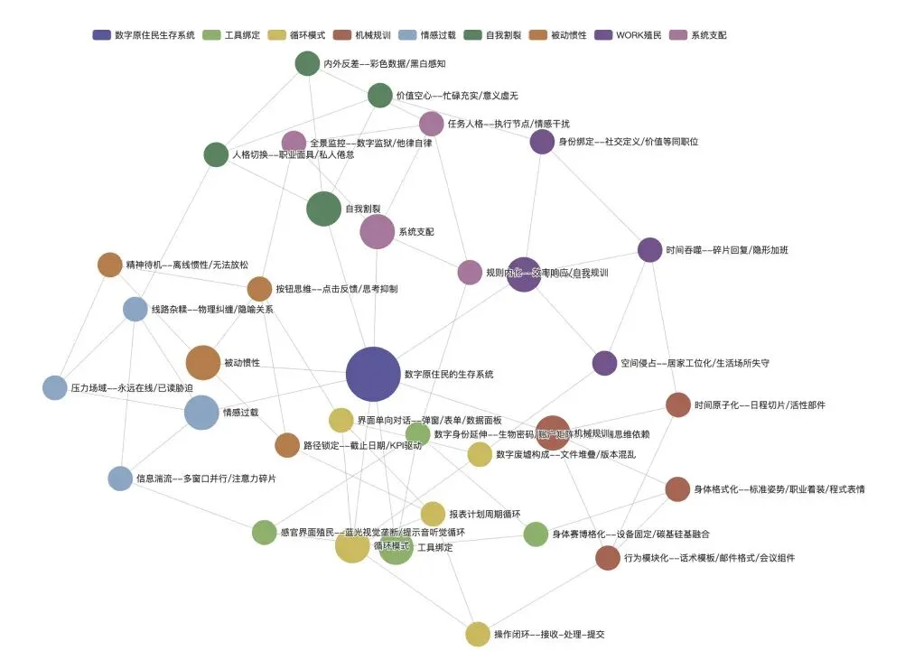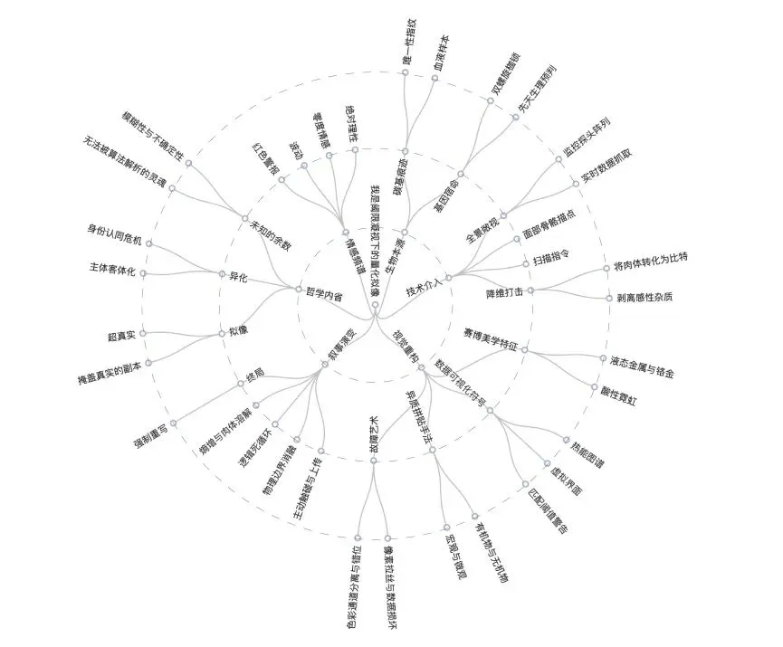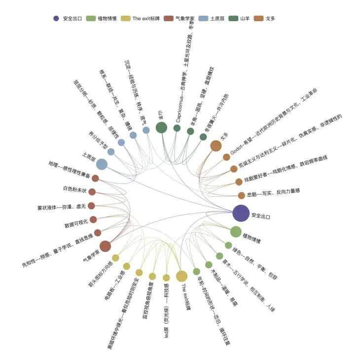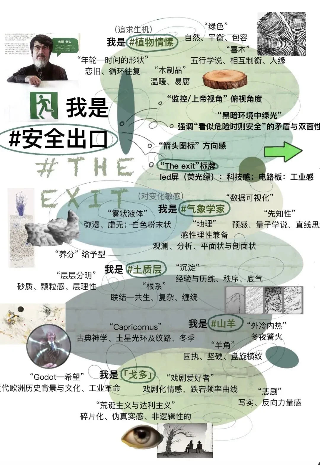 将自我挖掘中提取的与个人有关的元素,有逻辑地串联成一段完整的故事线索。通过思维导图推演,提取核心关键词,将抽象的情感与记忆转化为可视化的视觉语言,形成半开大小的综合画作。此时,散落的个人经验已被凝练为充满张力的平面叙事——一幅静止却蕴含时间性的"视觉诗篇"。