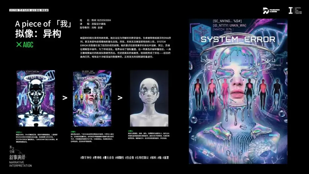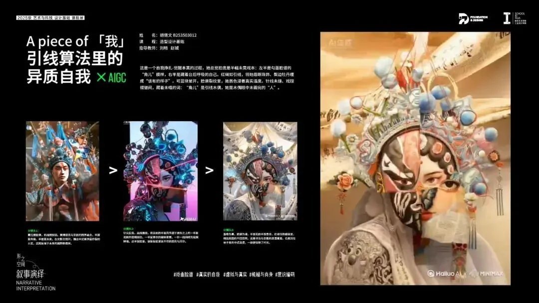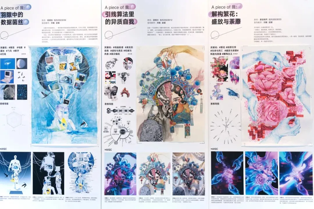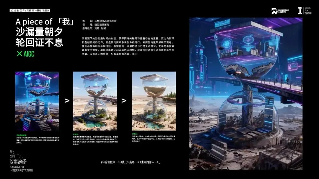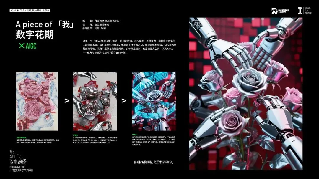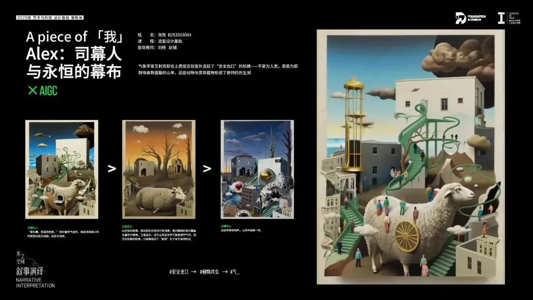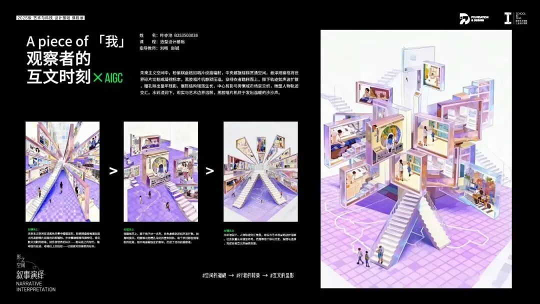 借助AIGC工具,将平面综合画作转化为具有个人情感表达体验的可视化电子图像,并且结合AI的动态演绎能力,将静态的画作构成演化成动态的叙事视频,形成设计思想与情感的综合表达,完成从"静"到"动"的叙事闭环。这不仅是维度的再次升级,更是用设计思想谱写的自我叙事诗篇。