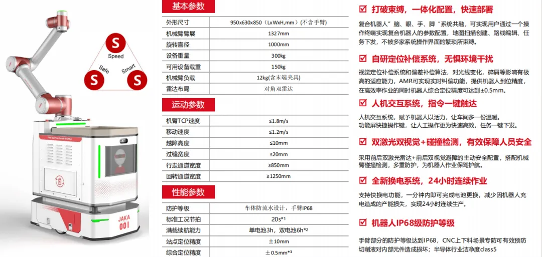JAKA复合机器人打破束缚,一体化配置,快速部署 自研定位补偿系统,无惧环境干扰人机交互系统,指令一键触达,全新换电系统,24小时连续作业。