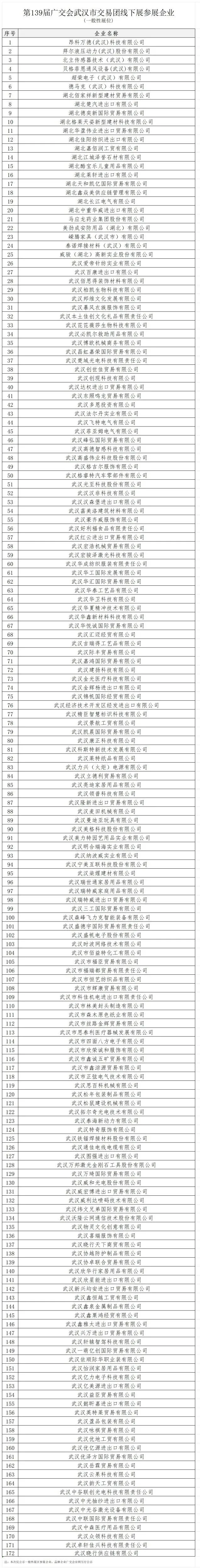 为切实做好第139届广交会武汉市交易团相关工作,根据《中国进出口商品交易会出口展一般性展位数量安排办法》、《中国进出口商品交易会关于第139届广交会出口展组展工作的通知》等文件精神,在企业自愿申请的基础上,按照商务部、中国对外贸易中心文件和武汉市交易团操作规程,我团组织进行评审,现将参展企业名单予以公示(见附件),公示时间为2026年3月18日起三个工作日。后续名单如有增补或变化,将通过广交会易捷通系统或电话另行通知。