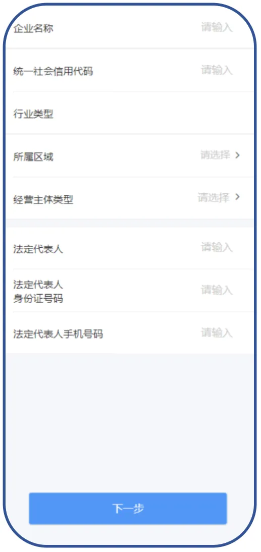 完成账号注册/登录后,根据页面提示,填写企业信息与法定代表人信息,点击“下一步”按钮,在系统验证通过所填写信息后,完成企业信息认证。