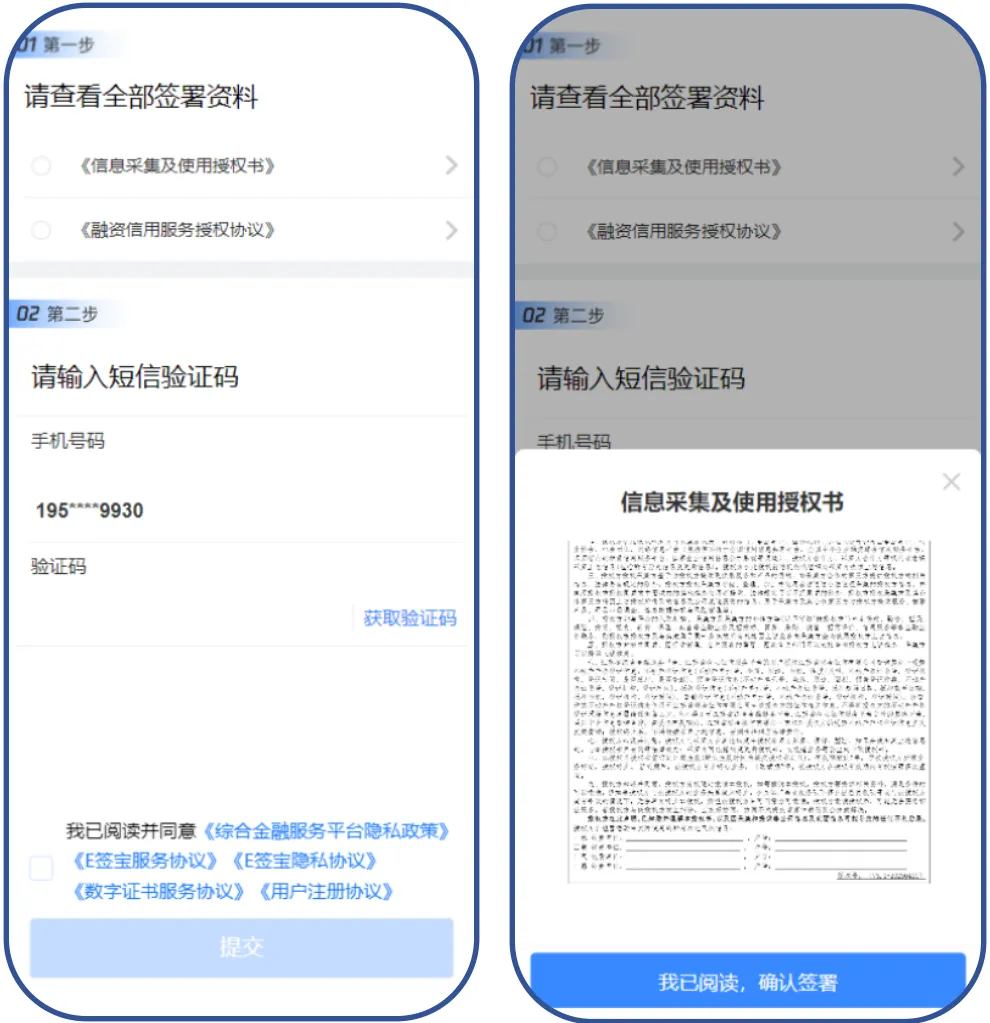 在完成信息认证后,页面展示待签署授权书,点击资料右侧箭头标识可预览需签署授权书模板。点击“我已阅读,确认签署”按钮后,即表示同意本资料的签署。在完成资料的签署确认,获取并填写短信验证码后,即可提交并完成授权书签署。