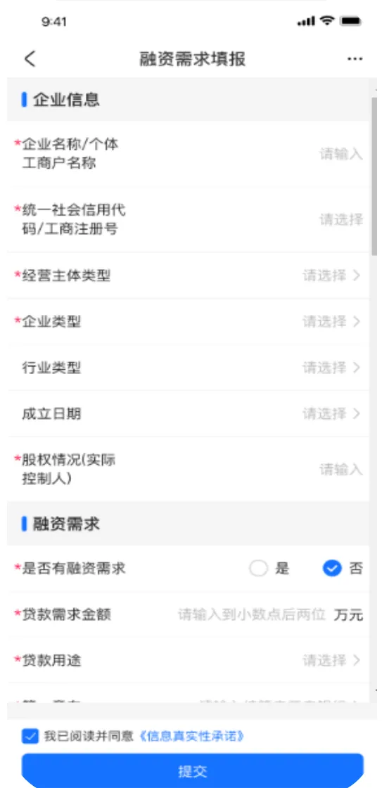 在完成授权书签署后,即可开始融资需求填报。请按照页面提示如实完成内容填报,最后点击“提交”按钮,即可完成融资需求填报。注意:请确认填写真实准确,避免融资需求无效。