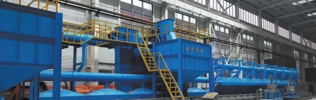 生产线大致分为五个部分:由砂箱,摆渡机构,推箱机构组成砂箱循环使用的基础功能;由翻箱机,落砂振动筛,落砂滚筒筛组成铸件分离功能;由分离筛,斗提机,绞龙、砂库、振实台,埋型砂冷却设备,废砂收集设备组成埋型砂的循环功能;由浇铸侧吸罩,冷却封闭罩,翻箱除尘罩,摆渡车封闭罩,除尘器,活性炭,风机组成生产线去尘、去味部分;使用定制铁水包转运小车、地轨式浇铸机、行车式浇铸机进行浇铸,缩短铁水转运时间,省人省力,操作方便灵活。