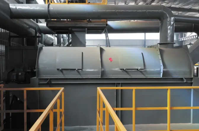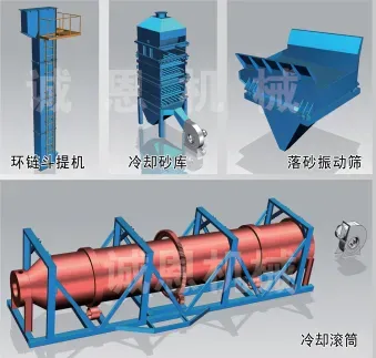 本设备采用双层滚筒结构,等于物料输送距离大了一倍,滚筒外层采用水冷,通过滚筒外壁的循环水将物料热量带走;滚筒内层采用风冷,通过高压风机将滚筒内的热量直接移走。此设备结构简单,降温效果显著。性能特点:物料通过三道被水包围的管道与外面水箱的循环水进行热量交换热水由闭式冷却塔进行冷却,出来的冷水进入设备水箱中完成循环。由于循环处于密封状态,则能保证物料不会受潮以及循环水不受污染。 采用双层筛网结构,粗砂,细砂一次性筛出。筛网使用不锈钢长条孔,不易堵塞,耐磨性强,圆筒筛具有筛分能力强,噪音小,易于封闭无烟尘的特点。 本公司生产的浇铸测吸罩采用流动集中式除尘,每台罩子上带有电控气动阀门,随开随关,避免风量浪费。冷却封闭罩结构牢固,外形美观。翻箱出货区域是尘烟重点区,兼具日常检修维护,我厂设计翻箱除尘罩时将摆渡车封闭罩一并考虑当中,整体除尘效果显著,配套设备常用脉冲除尘器、活性炭吸附箱、除尘风机、烟筒、整体管道布置,给出一站式解决方案。