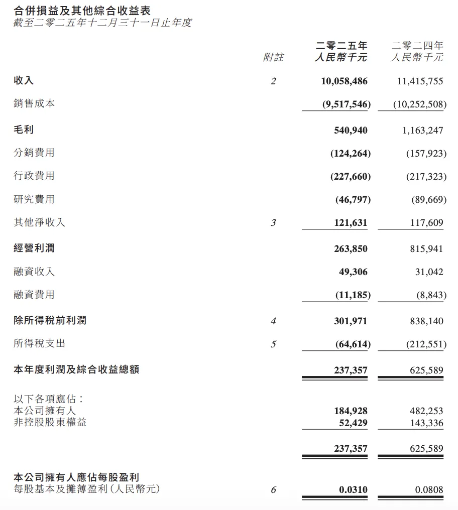 投资参考网记者查阅港交所披露易平台的完整公告核实,2025年中国淀粉实现营业收入100.58亿元,同比下降11.9%;实现毛利5.41亿元,同比骤降53.5%;经营利润2.64亿元,同比下滑67.7%;本年度利润2.37亿元,同比下降62.1%;每股基本盈利0.031元,同比下降61.6%,所有核心盈利指标均出现两位数以上的大幅下滑。