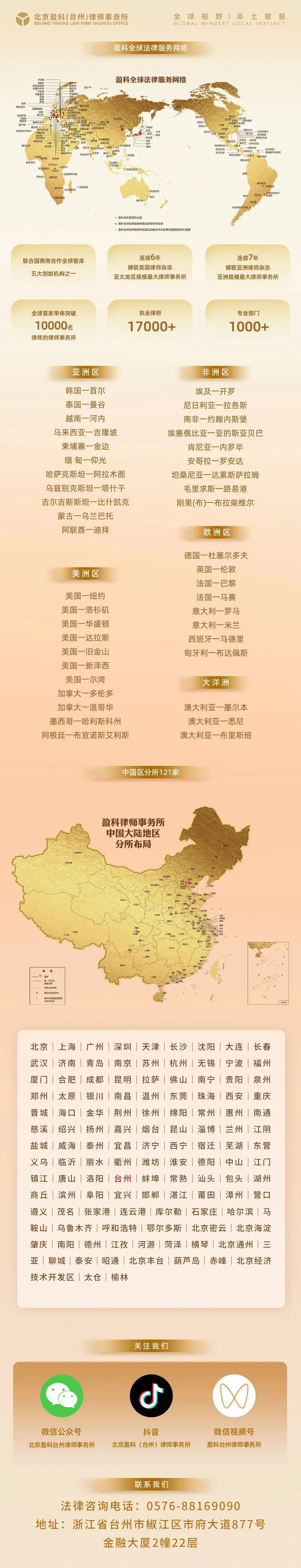 盈科律师事务所是一家全球化法律服务机构,成立于2001总部位于中国北京,是联合国南南合作全球智库网络联合创始机构。盈科坚持“党建引领,建设国际一流律师事务所”,秉承“全球视野、本土智慧”,2021年开启“国际化、专业化、数智化、碳中和”高质量发展新阶段。盈科致力于搭建“全球一小时法律服务生态圈”,在中国大陆地区拥有121家分所及1家粤港澳联营律所,盈科全球法律服务网络已经覆盖了103个国家和地区的194个国际城市。其中,盈科海外直营机构覆盖了40个国家的52个国际城市;盈科境外合作律所覆盖了92个国家和地区的174个国际城市。盈科成立二十余年来,已累计为超过1410000家海内外企业提供高品质法律服务。