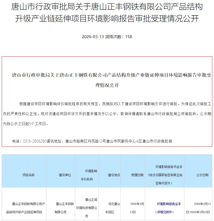 2026年3月13日,唐山市行政审批局关于唐山正丰钢铁有限公司产品结构升级产业链延伸项目环境影响报告审批受理情况公开,详情如下:项目名称:唐山正丰钢铁有限公司产品结构升级产业链延伸项目建设内容:为进一步优化公司产品结构,加速推进转型升级,完善公司产业链条,增强市场竞争力,正丰钢铁决定投资141260万元在现有北厂区北侧实施“唐山正丰钢铁有限公司产品结构升级产业链延伸项目”,建设内容为:引进达涅利第六代EWR无头焊接轧制工艺设备,采用高精度、高刚度、高速轧机,建设智能全连轧型钢生产线2条(配套智能全氧燃烧步进加热炉2座),配套建设环保、水系统及供配电等附属设备设施。项目建成后,年产精品型材200万吨。该项目已在河北省发展和改革委员会进行备案。主要生产单元:连铸坯准备、装炉、加热、出炉、无头焊接、粗轧、中轧、精轧、冷却、矫直、剪切、码垛、打捆、浊环水处理单元等。项目产品:主要作为现有轧钢产品新拓展产品的补充生产线,主要生产工程机械用钢,耐候钢和高强度耐候钢,船舶及海洋工程结构用钢、海洋用耐候耐蚀钢和不锈钢。本项目产品成材率、强度、耐候性、耐腐蚀性高于现有工程轧钢产品。