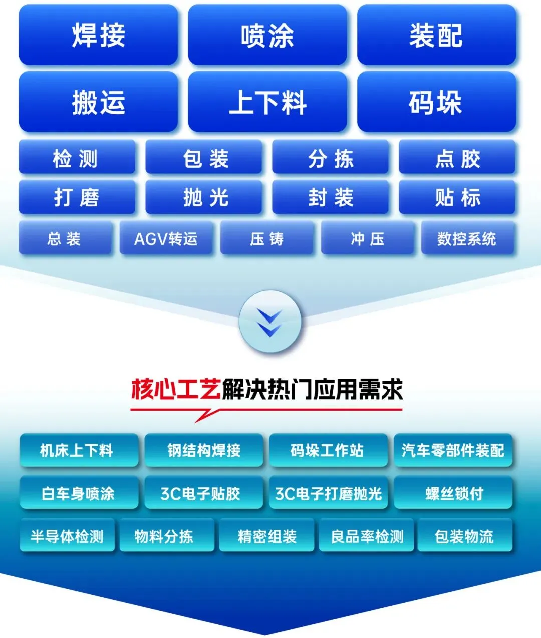 钱江机器人熟练掌握焊接、切割、喷涂、打磨抛光、分拣、装配、上下料、搬运码垛等多种工艺,广泛应用于汽摩配、3C、五金、食品饮料、金属加工等行业。