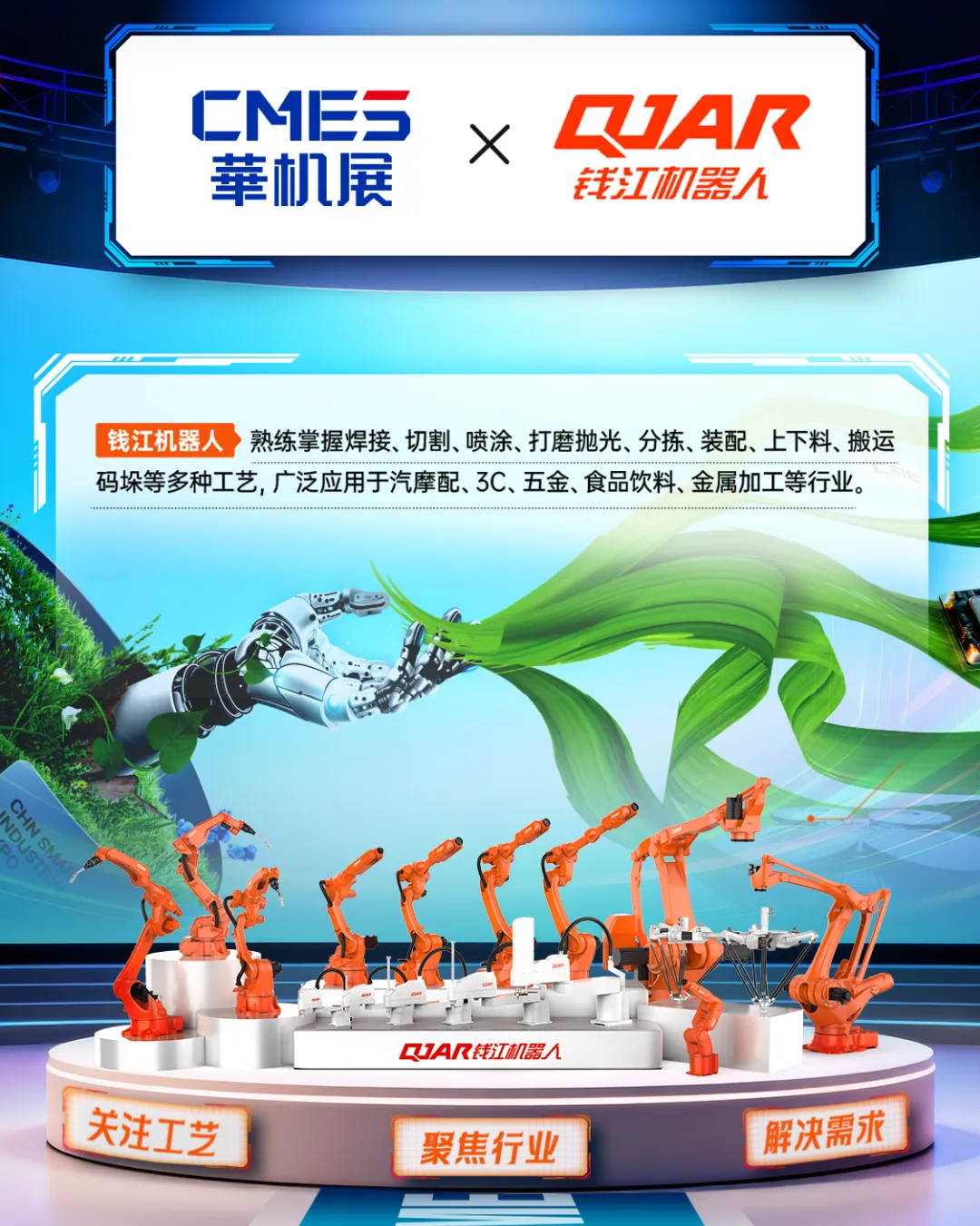 本届CMES华机展汇集钱江机器人、长广溪智造、遨博智能、全传科技、节卡等品牌企业,聚焦汽车零部件制造、3C电子与半导体、金属加工等长三角热门行业,集中展出焊接、打磨、检测、上下料、包装物流等重点自动化工艺解决方案。