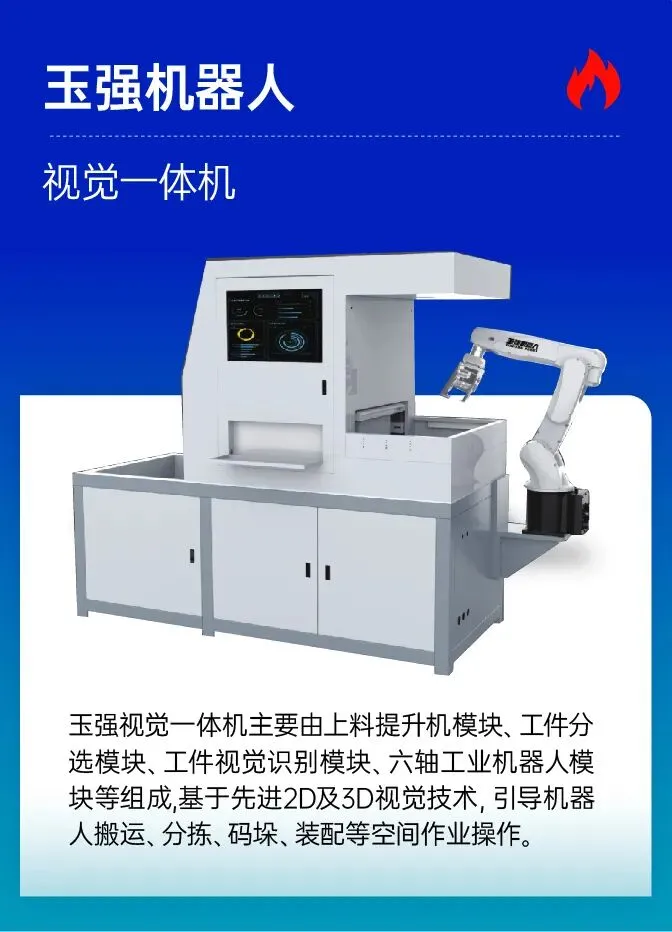 玉强视觉一体机主要由上料提升机模块、工件分选模块、工件视觉识别模块、六轴工业机器人模块等组成,基于先进2D及3D视觉技术,引导机器人搬运、分拣、码垛、装配等空间作业操作。