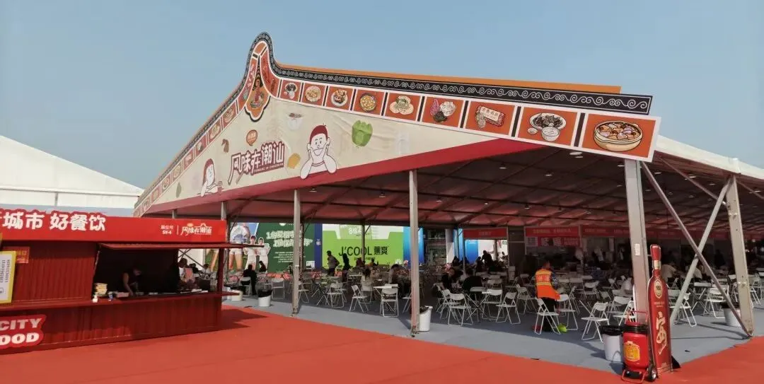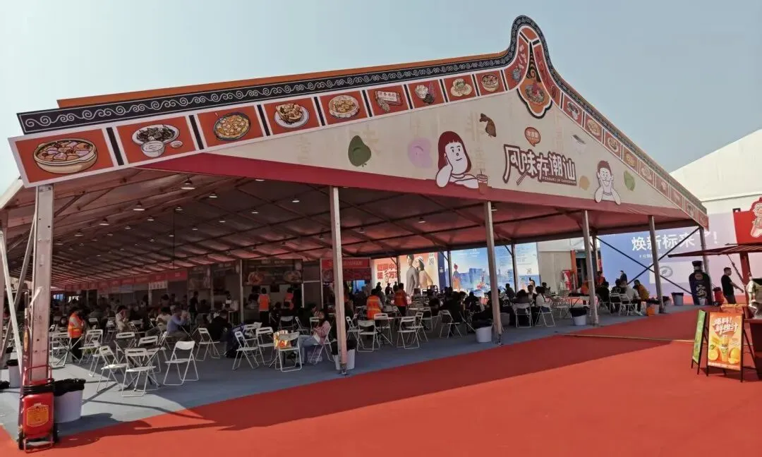蓝白渐变颜色展会门头与潮汕风情篷顶,分别以发光灯带美食插画点缀营造氛围,材质硬朗鲜活,兼具专业与烟火气。