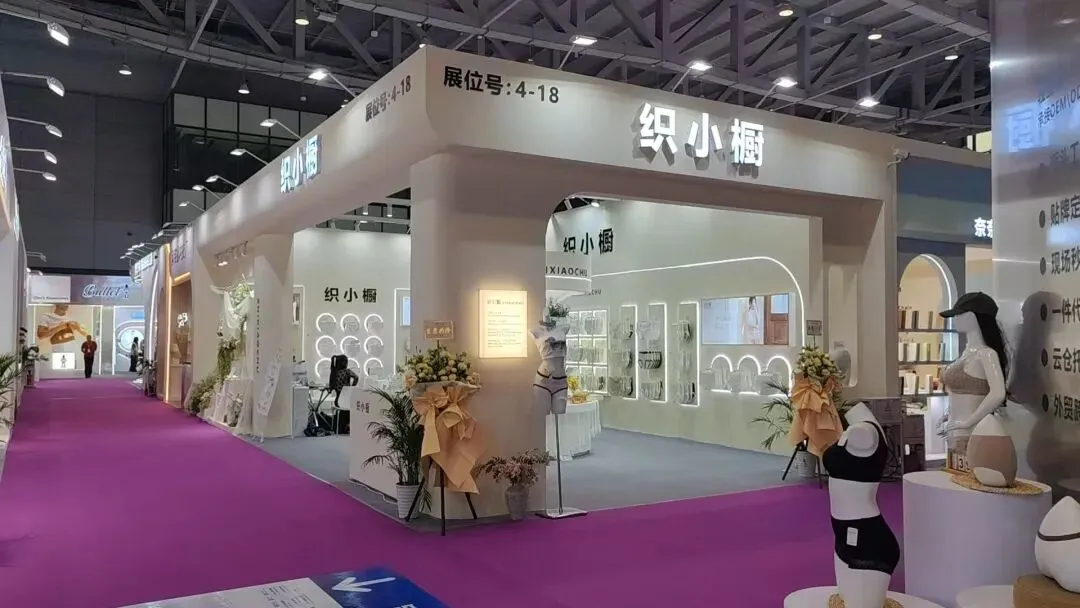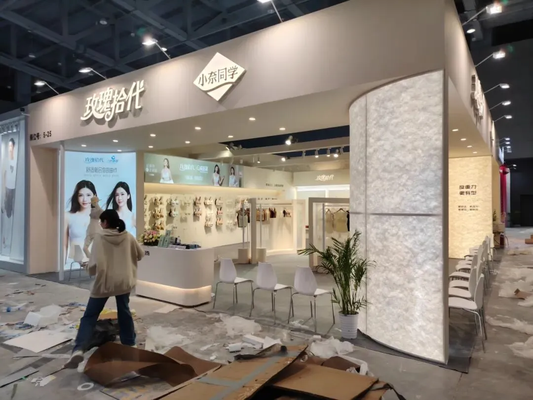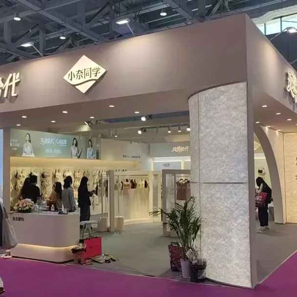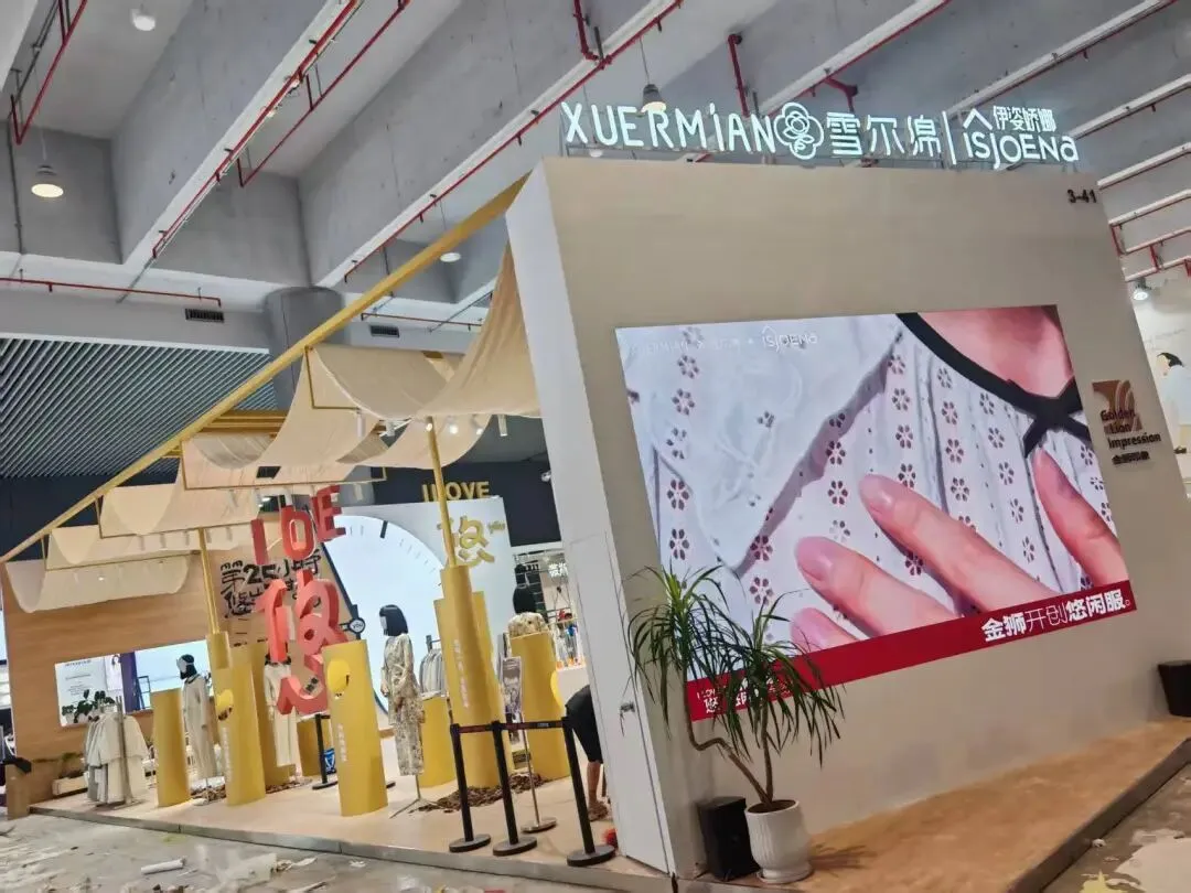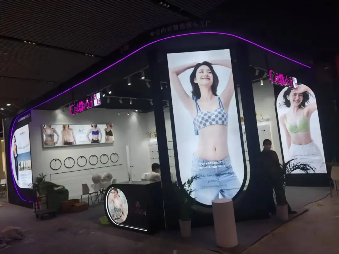 该展位以浅米色主调,搭配杜邦纸透光弧形立柱,发光灯箱与规整陈列,简约大气,尽显内衣品牌的舒适与精致感。