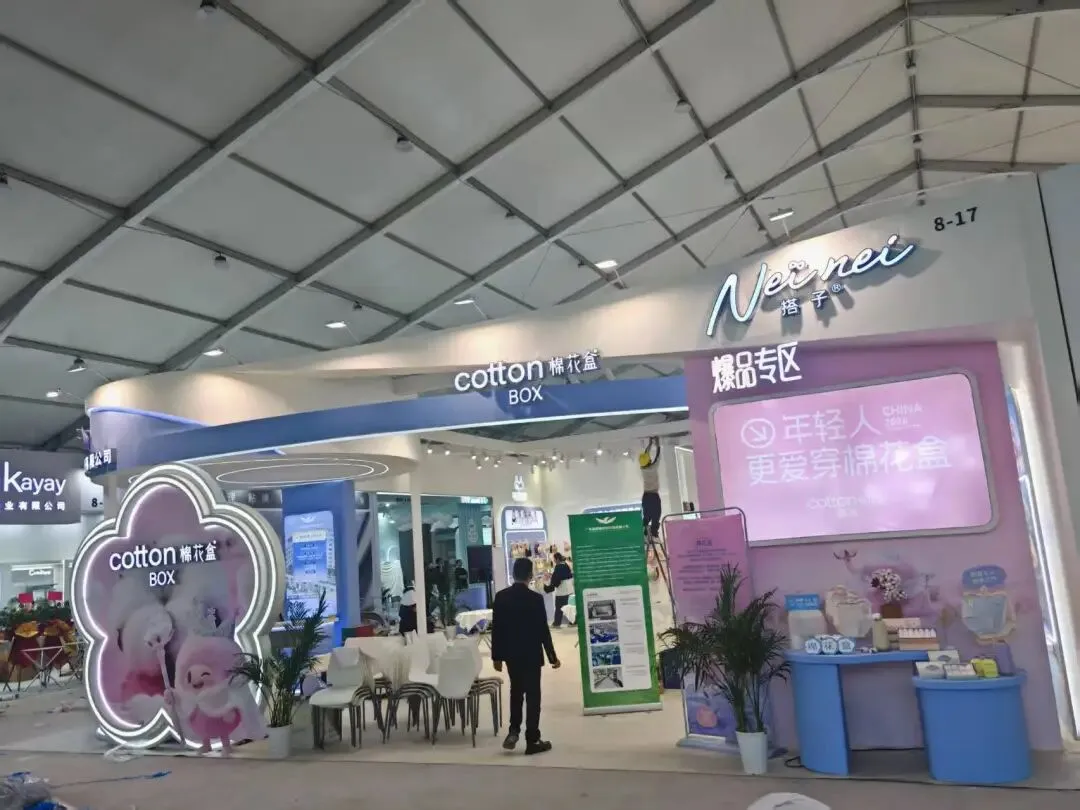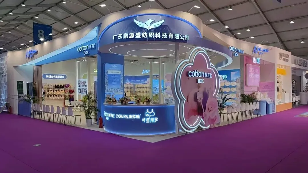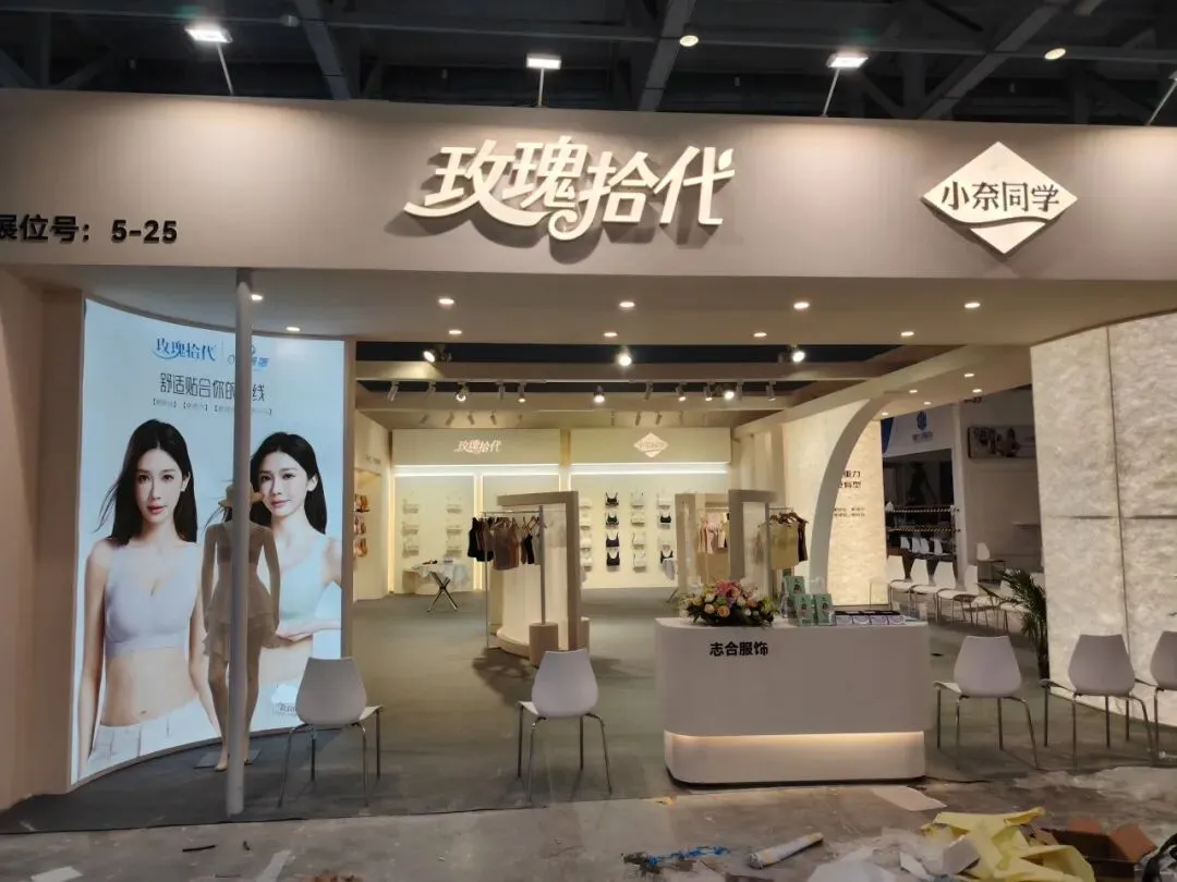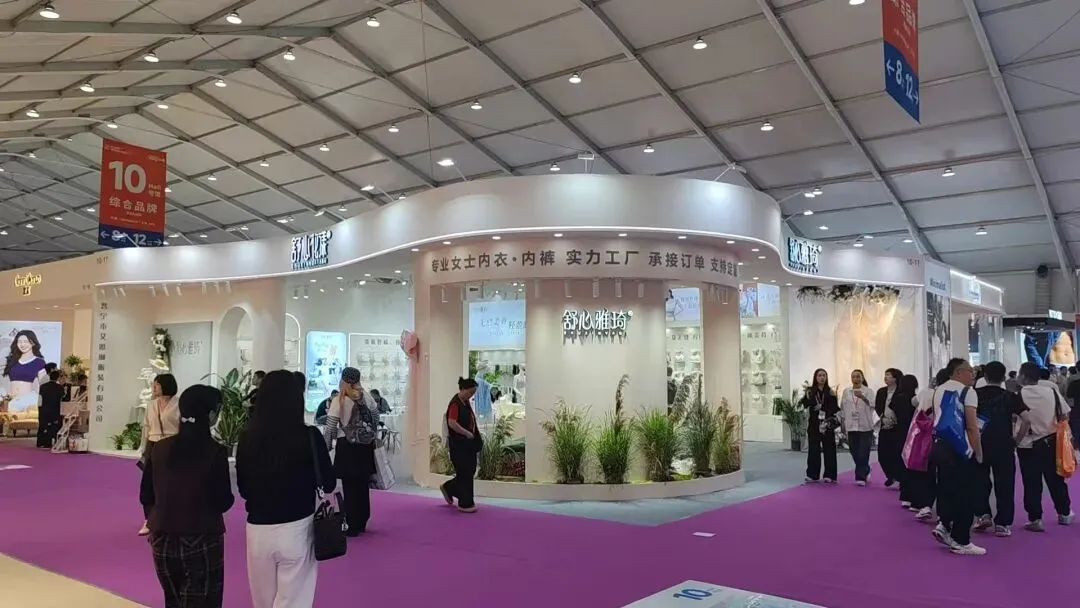 该展位以浅米色主调,搭配杜邦纸透光弧形立柱,发光灯箱与规整陈列,简约大气,尽显内衣品牌的舒适与精致感。