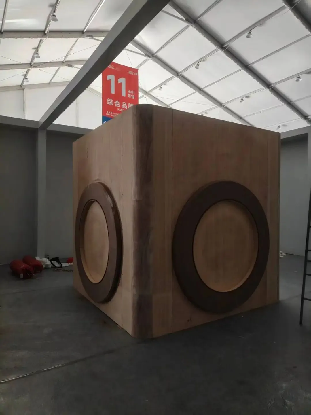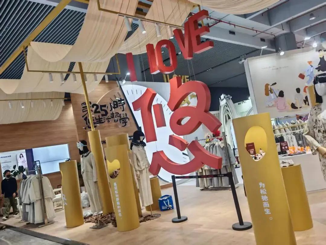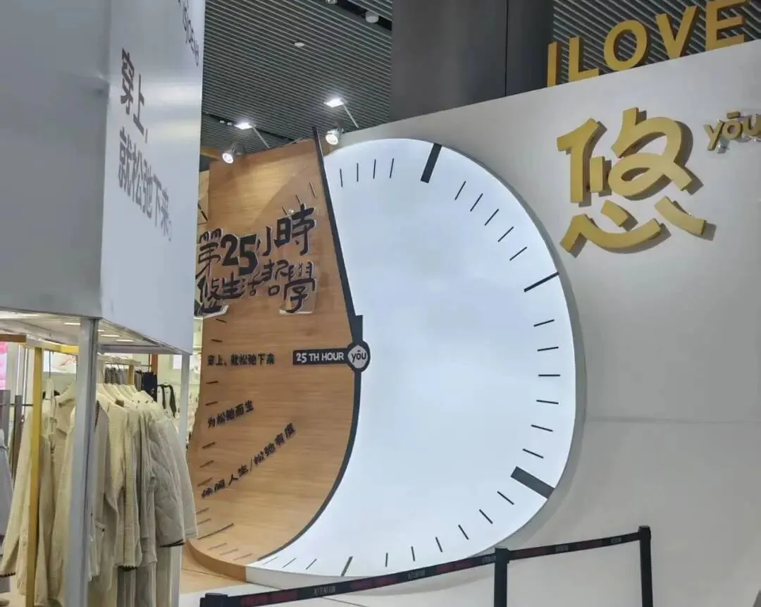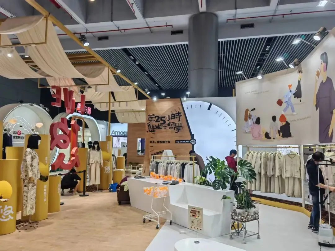 该展位以暖木色与米白为主,搭配金色立柱与巨型时钟装置,悬挂米色纱幔,营造松弛慵懒的居家氛围,传递“第25小时”生活哲学。