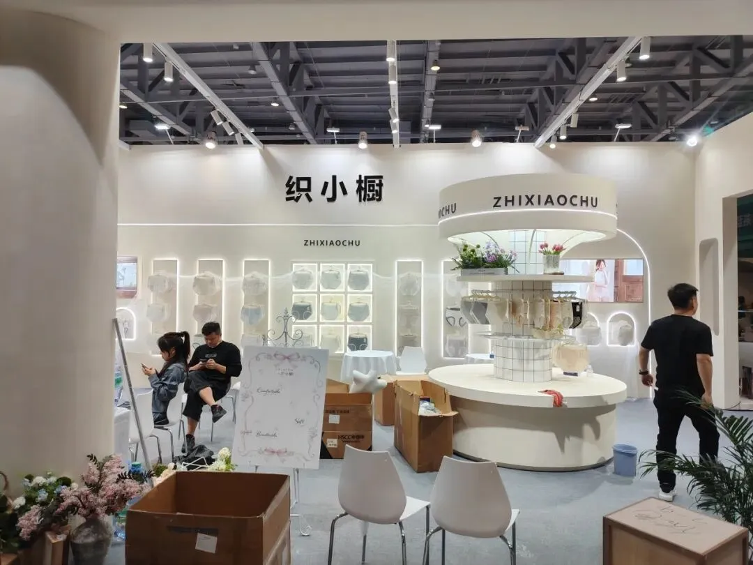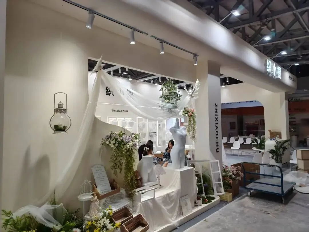 该展位以奶白奶油风为主,弧形结构与圆台中岛形成通透动线,白纱花艺点缀,灯光柔和,陈列有序,温馨又高级。
