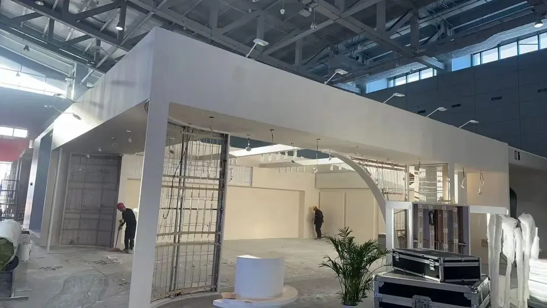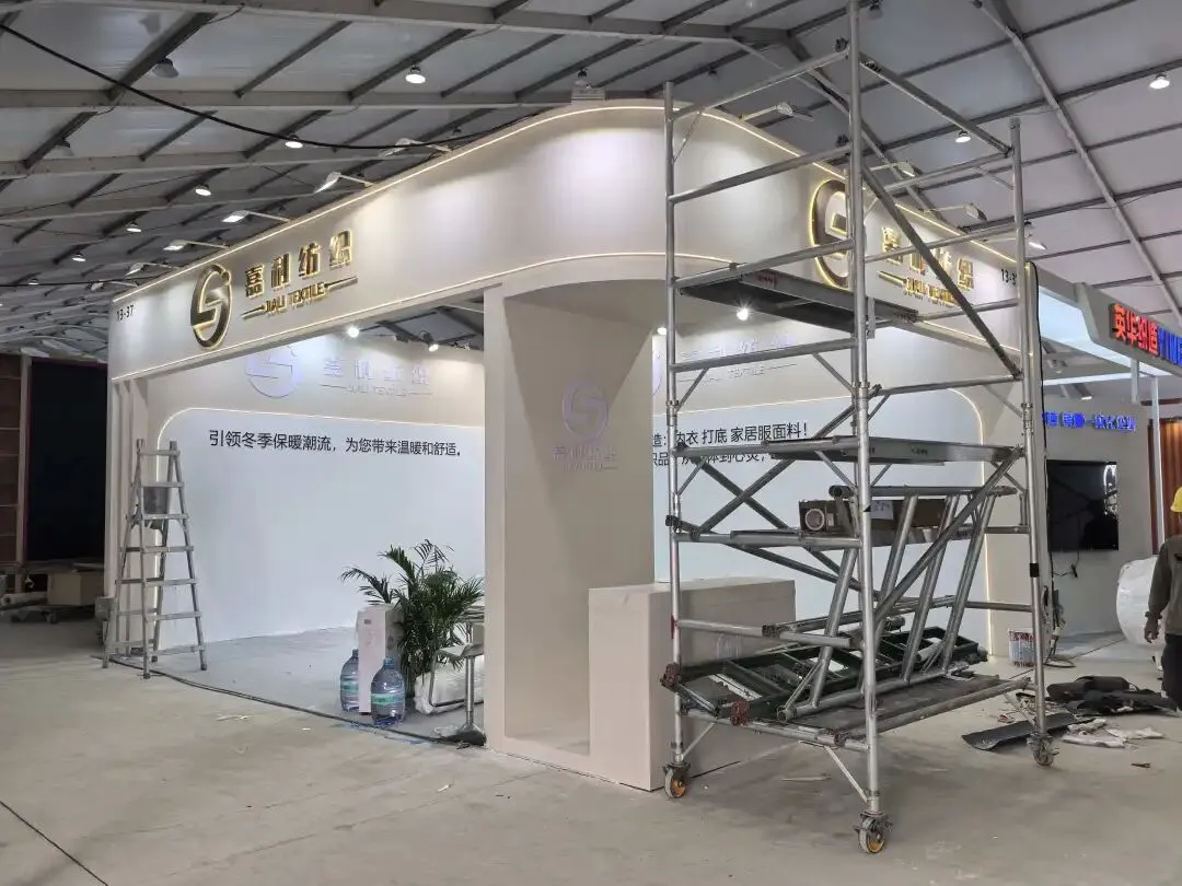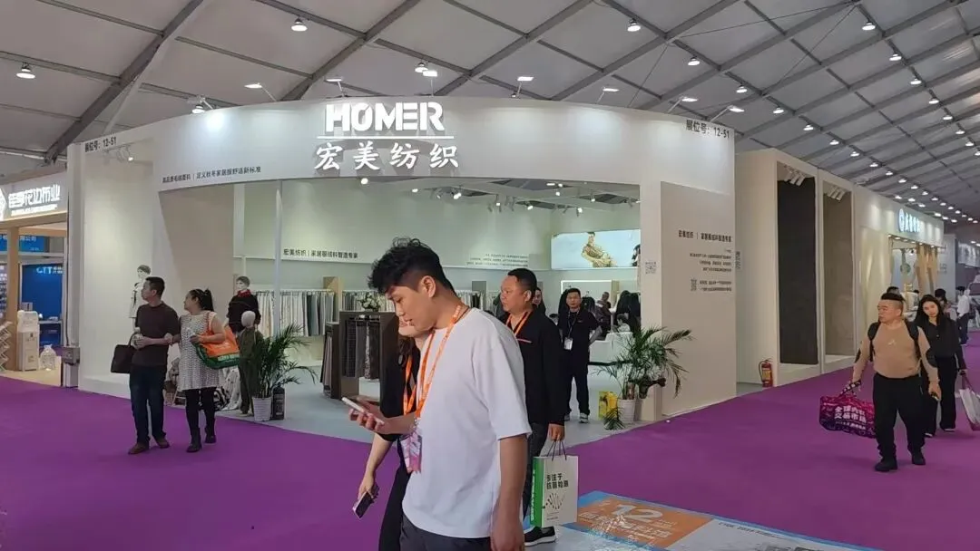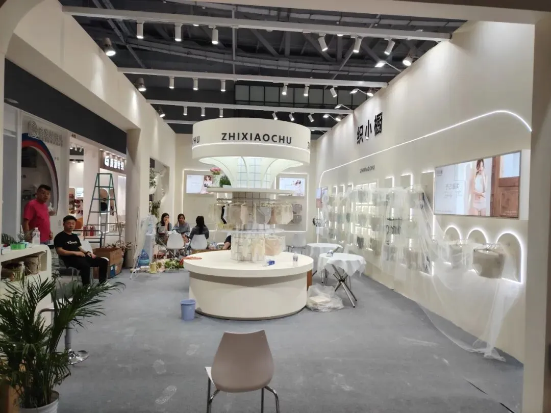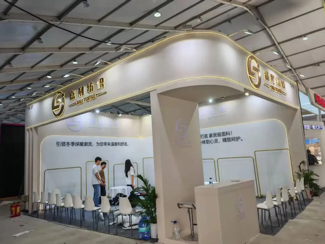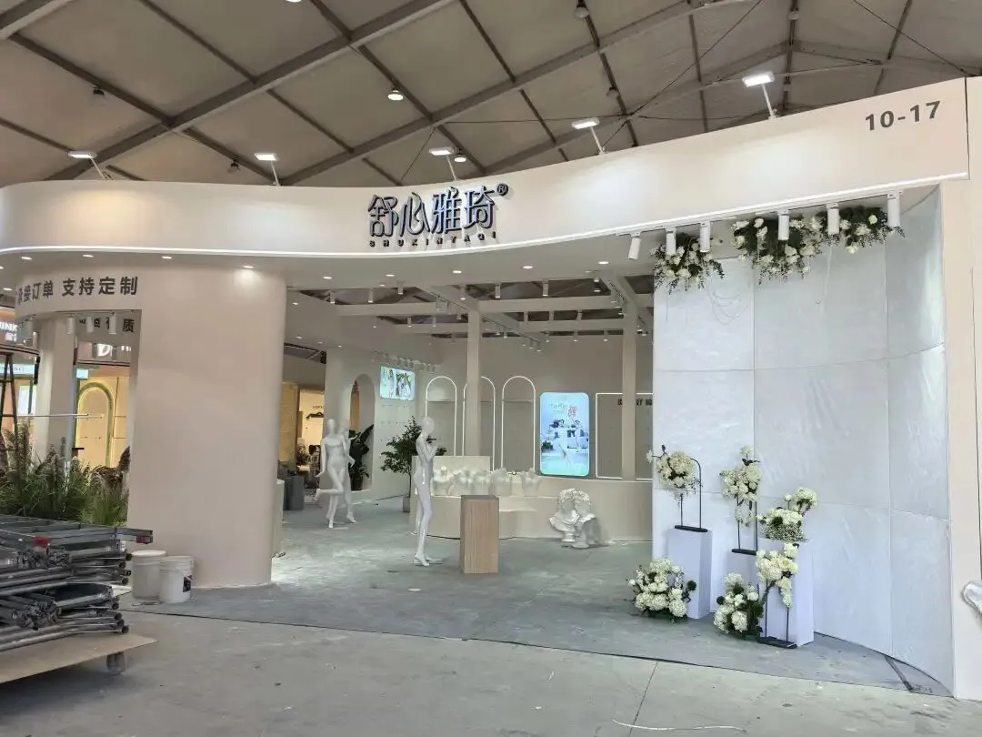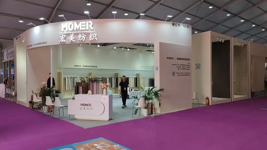 该展位以弧形白色展墙搭配浅灰内饰,简约现代,以布艺展品营造专业质感,灯光柔和凸显品牌格调。