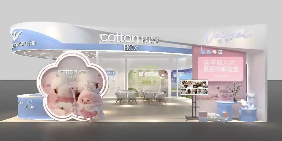 展位以蓝白烤漆弧形门头搭配棉花造型亚克力做灯箱,金属骨架支撑,灯带勾勒轮廓,通透精致,尽显纺织品牌自然质感。