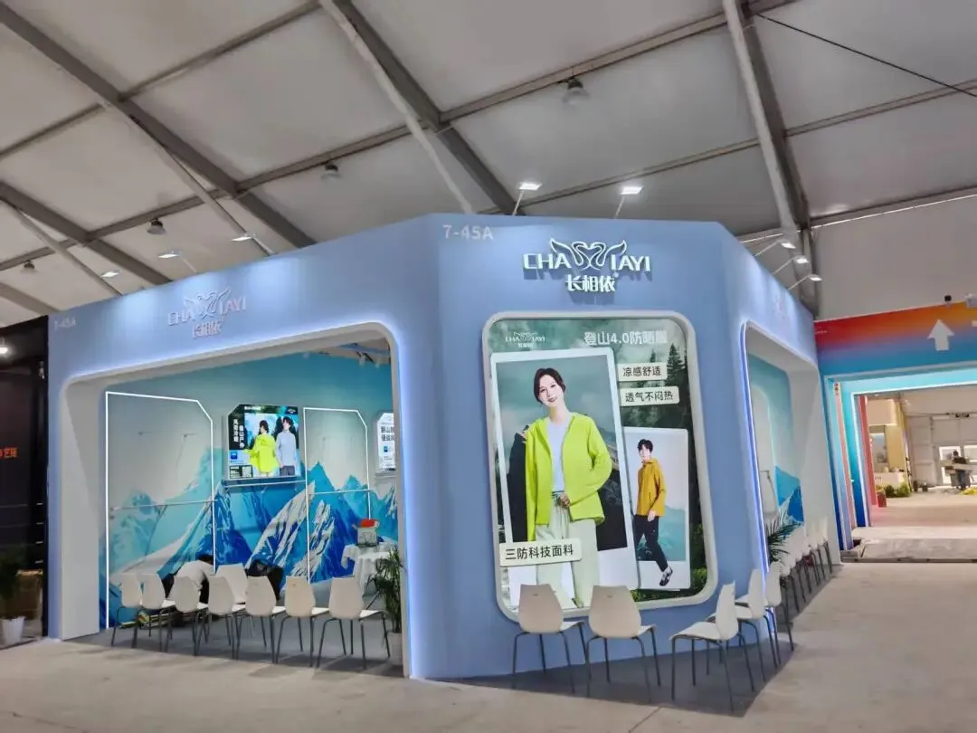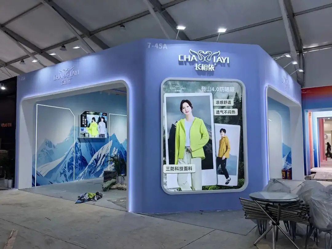 展位以浅蓝色调搭配雪山主题喷绘,弧形发光门框勾勒轮廓,木质陈列区简洁大气,尽显户外服饰的清爽质感。