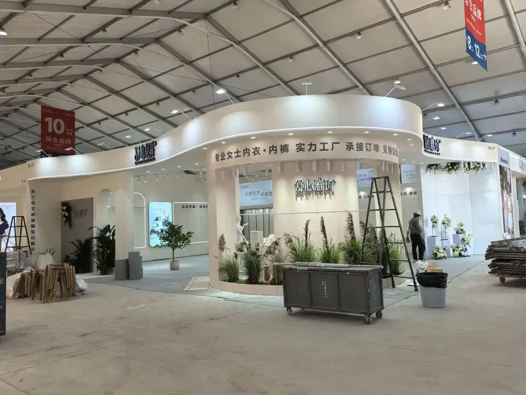 展位以奶杏色弧形木饰面门头,搭配柔光灯带与花艺绿植,拱门造型通透雅致,尽显内衣品牌温柔质感。