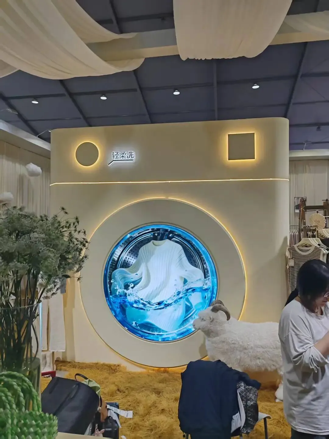 该装置以米黄弧形软包墙搭配洗衣机造型灯箱,草地面与花艺点缀,温柔治愈,尽显衣物洗护的舒适感。