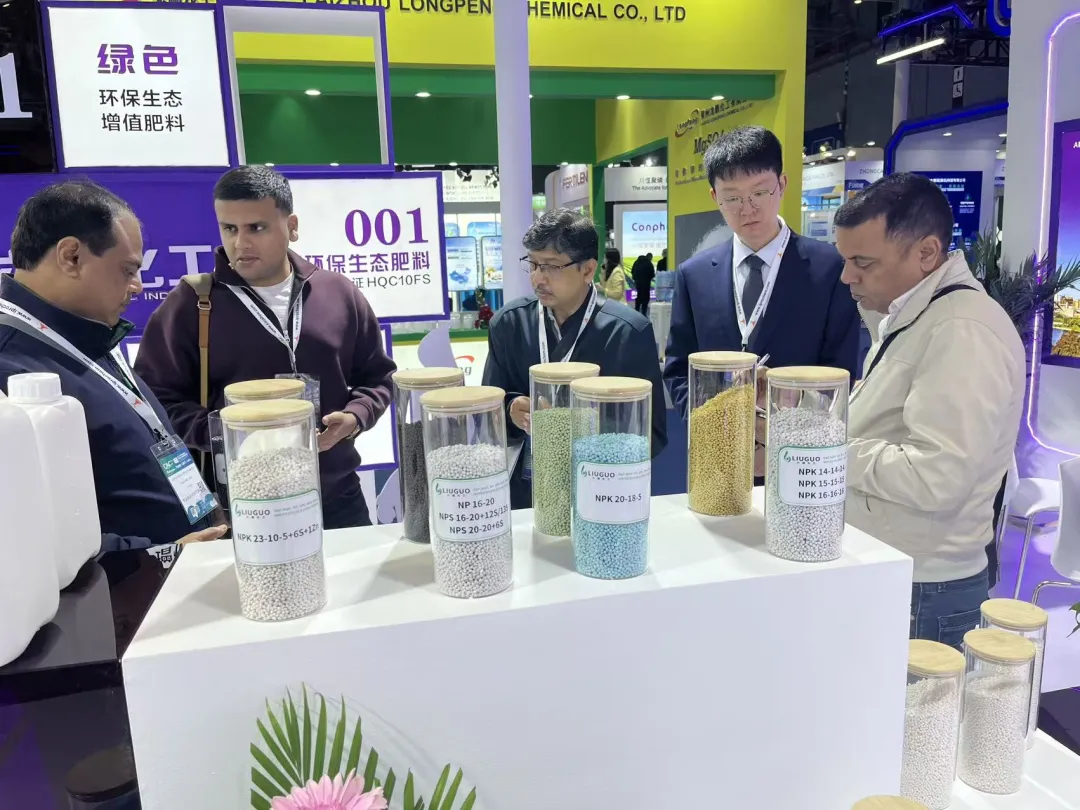 走进公司展台,DAP、MAP、NPK+等出口产品依次陈列,同时,芯五功、六国网、五大料、海藻酸肥料等新型产品也一同展出。展台陆续接待了来自南美、东南亚、日韩等地区的客商。公司领导及业务团队围绕产品规格、出口合作等事宜,与来访客户进行了沟通交流。