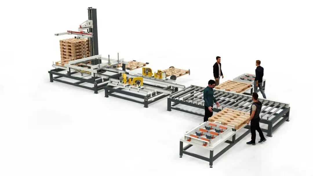 “从木板/脚墩到木托盘成品出来自动码垛,一键智造!木托盘生产线,定义标准新高度。”