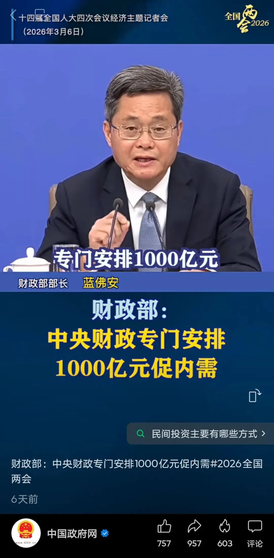 据财政部部长蓝佛安透露,千亿元级的财政资金,可以支持撬动万亿元级信贷,实现“四两拨千斤”的效果。