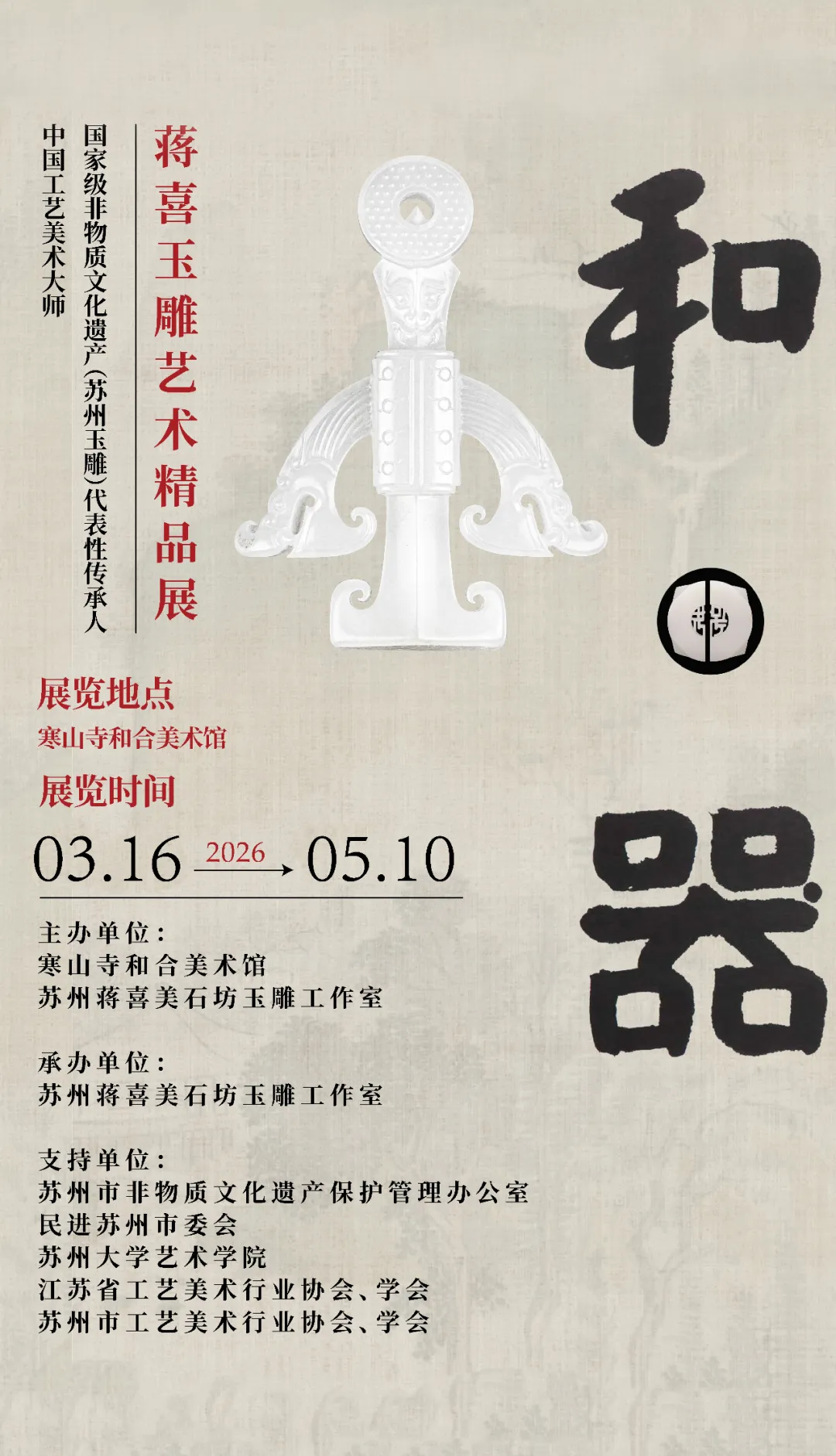 2026年3月16日,由寒山寺和合美术馆、苏州蒋喜美石坊玉雕工作室主办的“和·器:中国工艺美术大师、国家级非物质文化遗产(苏州玉雕)代表性传承人蒋喜玉雕艺术精品展”在寒山寺和合美术馆正式对公众开放。
