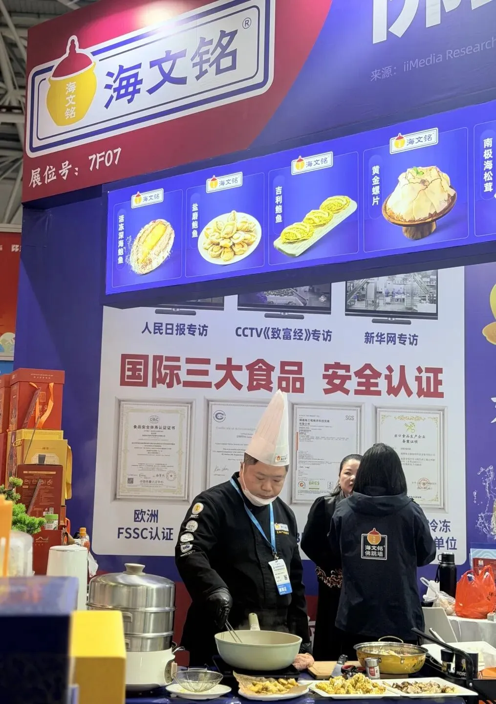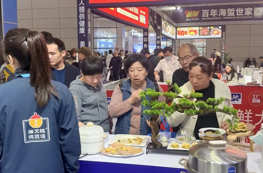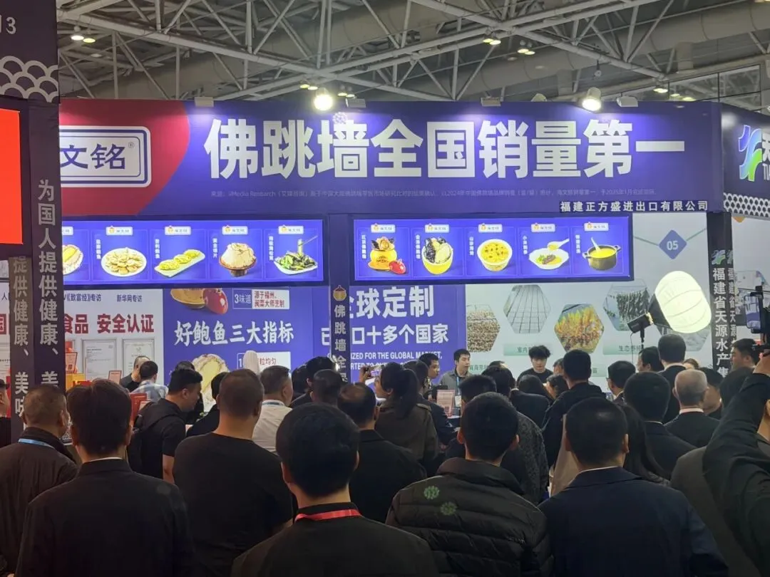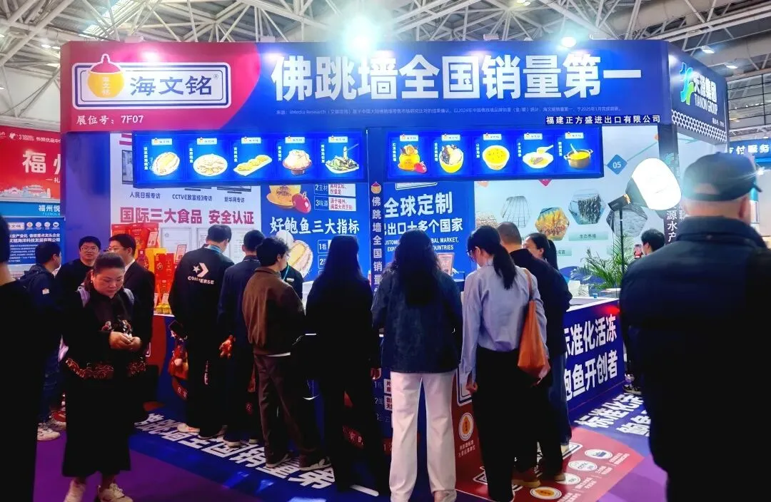 展会现场,海文铭展位人气高涨。除了经典的佛跳墙系列产品外,企业还带来了品类丰富的鲍鱼美食——活冻深海鲍鱼、盐磨鲍鱼、吉利鲍鱼等悉数亮相,吸引众多客商品鉴洽谈。来自美国、中东、东南亚等地区的采购商驻足交流,对产品的品质、出口资质及定制化合作表现出浓厚兴趣,为后续深入合作打下良好基础。