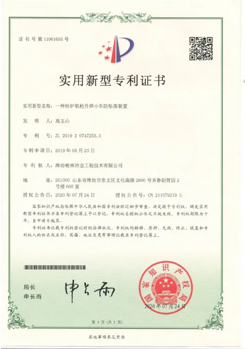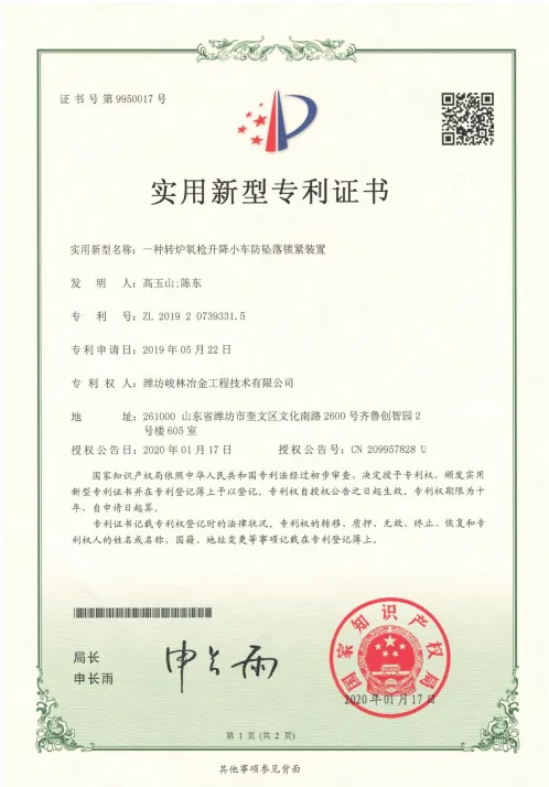 截至目前,公司已获得多项专利授权,涵盖了转炉氧枪快换装置、新式氧枪提升小车、转炉氧枪升降小车防坠落锁紧装置、集束射流喷头结构、转炉氧枪升降小车防坠落装置、氧枪刮渣器用刀、新式钢水自动测温取样送检系统等多个核心技术领域。这些专利技术的应用,不仅提高了公司产品的技术含量和附加值,也为客户提供了更加高效、安全、可靠的设备解决方案。