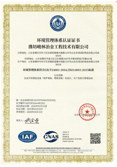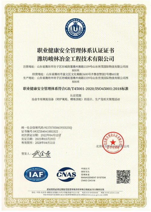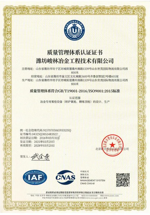 峻林冶金深知,质量是企业的生命线。为了确保产品质量,公司建立了完善的质量管理体系,并通过了GB/T19001-2016/ISO9001:2015 质量管理体系认证,认证范围涵盖冶金专用氧枪设备(转炉氧枪、精炼顶枪)的设计、生产。同时,公司还高度重视职业健康安全和环境保护工作,先后通过了职业健康安全管理体系认证和环境管理体系认证。