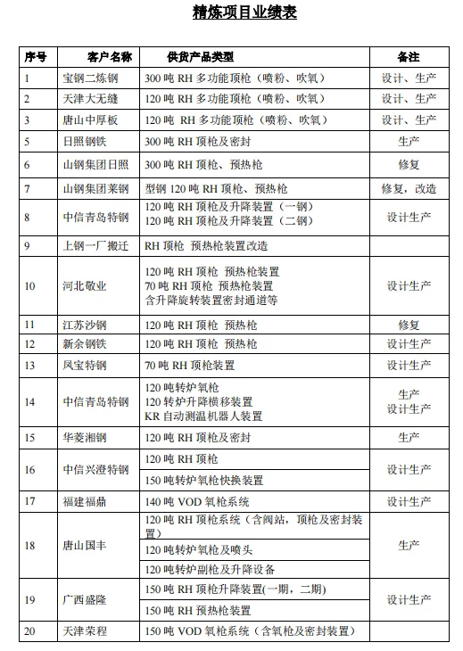 公司的经营范围广泛,涵盖转炉氧枪、副枪系统、氧枪本体、副枪本体、锻压喷头、铸造喷头、转炉刮渣器、快换氧枪改造、氧枪防坠落改造、炉外精炼顶枪、预热枪系统、顶枪本体、预热枪本体、密封通道、电炉氧枪及阀门站、设备修复及设备智能化改造等多个领域。目前,公司主营业务主要分为智能炼钢设备、副枪系统、设备升级三大板块,全面覆盖了冶金生产过程中的关键设备需求。