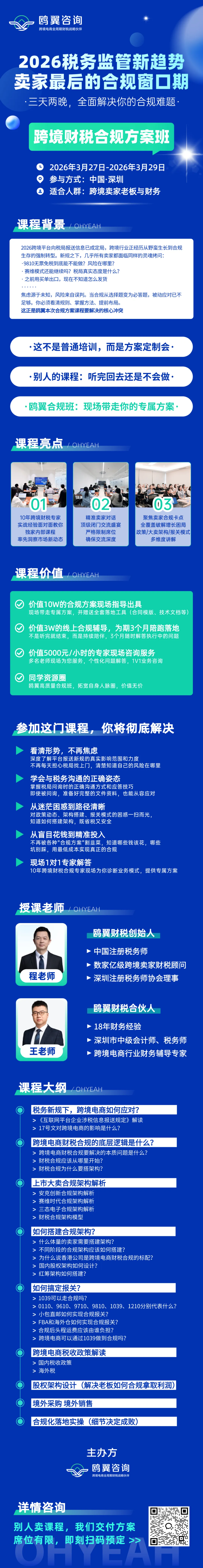 这里插一句,本月月底鸥翼咨询也会举办一场跨境财税方案班,创始人程老师也会亲自出席讲到这方面的新规及税务应对等内容,感兴趣的朋友抓紧约起来~详情如下图