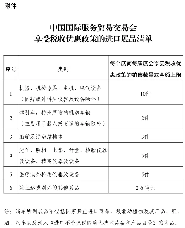 财政部 海关总署 税务总局关于中国国际服务贸易交易会展期内销售的进口展品税收优惠政策的通知北京市财政局,北京海关,国家税务总局北京市税务局,北京市国际服务贸易事务中心: 为支持办好中国国际服务贸易交易会(以下称服贸会),现就服贸会展期内销售的进口展品税收优惠政策通知如下: 一、对服贸会每个展商在展期内销售的免税额度内的进口展品,免征进口关税、进口环节增值税和消费税。享受税收优惠政策的展品类别和销售额度等规定见附件。 二、享受税收优惠政策的展品不包括国家禁止进口商品、濒危动植物及其产品、烟、酒、汽车以及列入《进口不予免税的重大技术装备和产品目录》的商品。 三、对每个展商展期内销售的超出附件规定的展品类别或销售额度的展品,以及展期内未销售且在展期结束后又不复运出境的展品,按照国家有关规定照章征税。 四、展商名单及展期内销售的进口展品清单,由北京市国际服务贸易事务中心或其指定单位向北京海关统一报送。 五、对享受税收优惠政策的展期内销售进口展品,进口后海关不按减免税货物实施后续管理。 六、每届展会结束后3个月内,北京市国际服务贸易事务中心应向财政部、商务部、海关总署、税务总局报送政策实施情况。 七、本通知适用于2026年至2027年期间举办的服贸会。 附件:中国国际服务贸易交易会享受税收优惠政策的进口展品清单.pdf