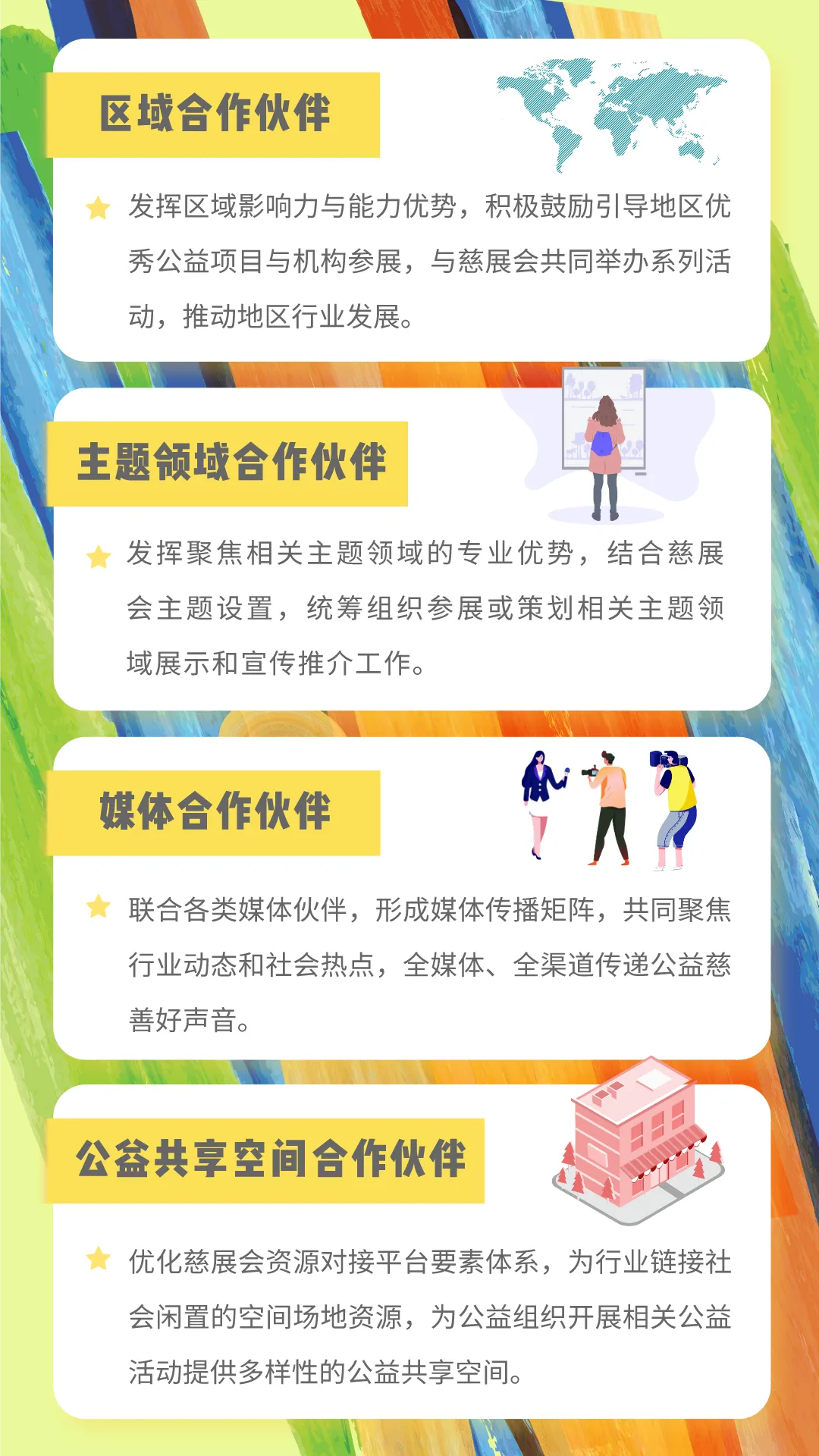 第八届中国慈展会“满天星计划”面向社会公开招募慈展会区域合作伙伴、主题领域合作伙伴、媒体合作伙伴、公益共享空间合作伙伴,以期更好地发挥行业联动作用,依托各地社会慈善力量,持续推进慈展会招展推介、资源对接和品牌传播等筹办工作,让我们携手化危为机,共建协作共创的行业生态!