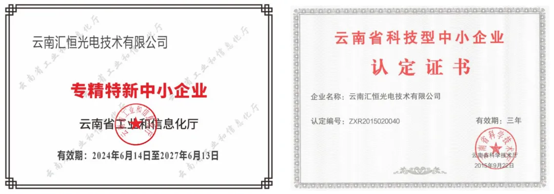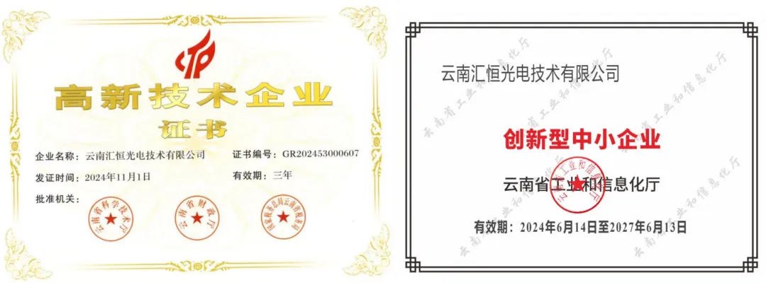 汇恒光电成立于2006 年6月,前身为国营云南光学仪器厂工业职工大学、技工学校实习工厂,2006 年国家进行国企改制,正式改制成为汇恒光电。公司荣获云南省科技厅“云南省科技型中小企业”,2020年11月26日获得“国家高新技术企业”,2024年获得“创新型中小企业”、“专精特新中小企业”。