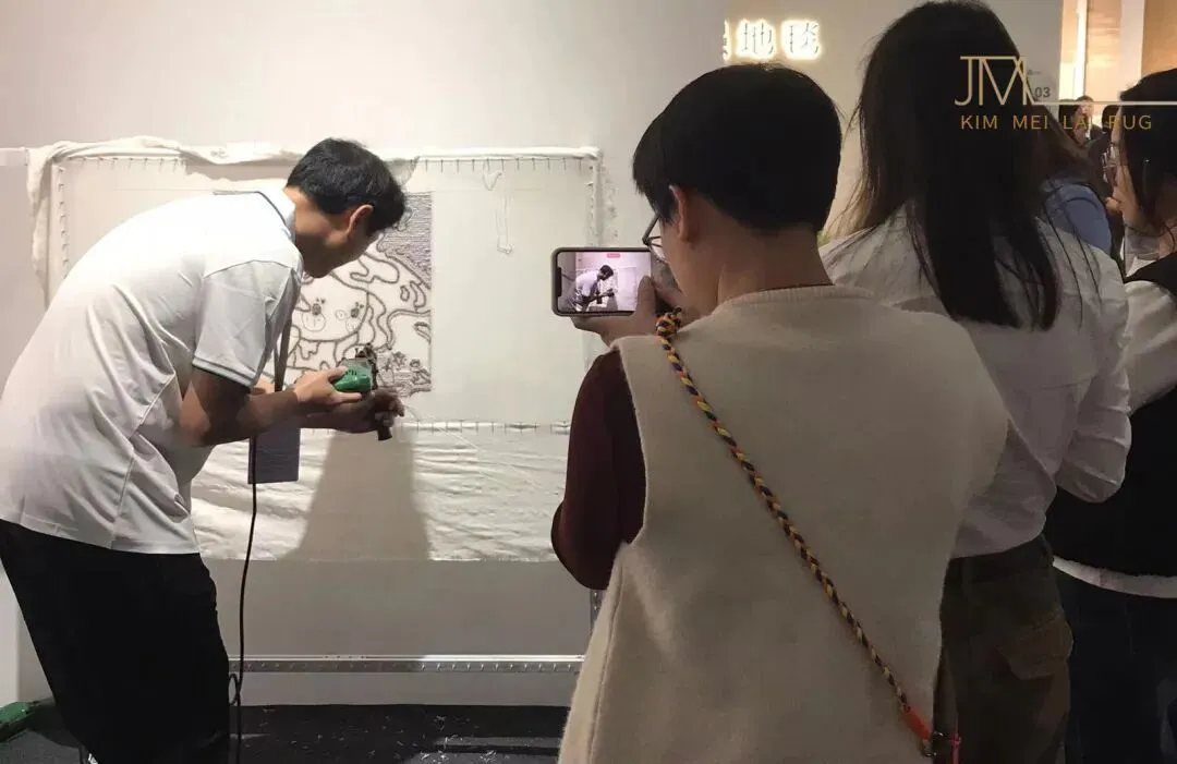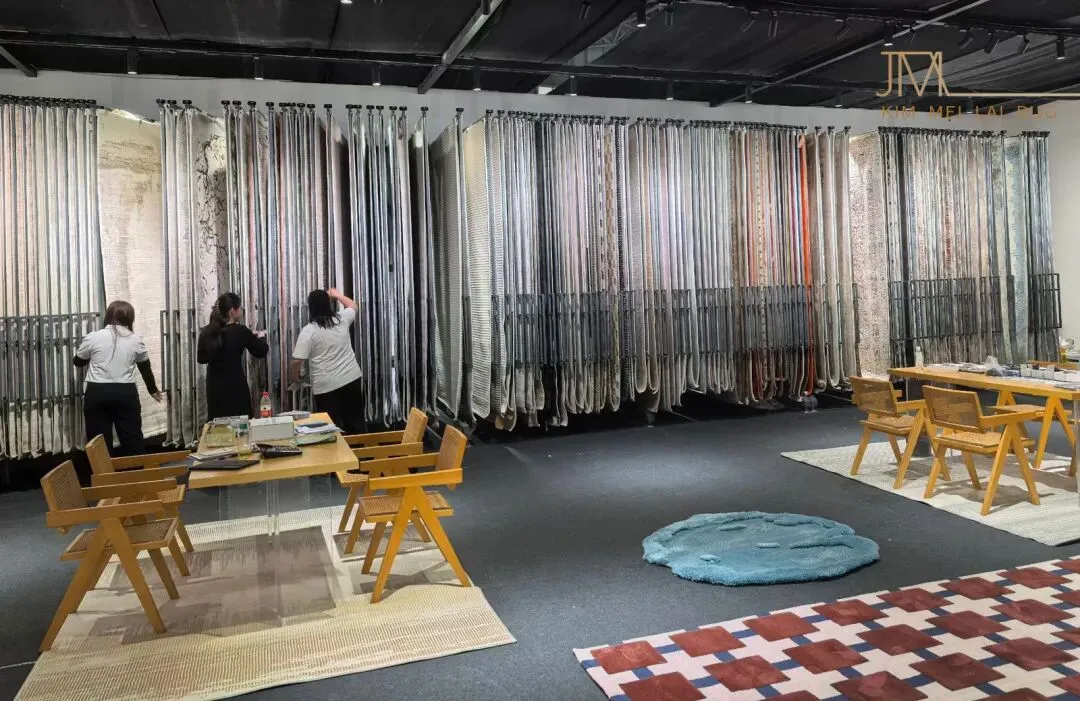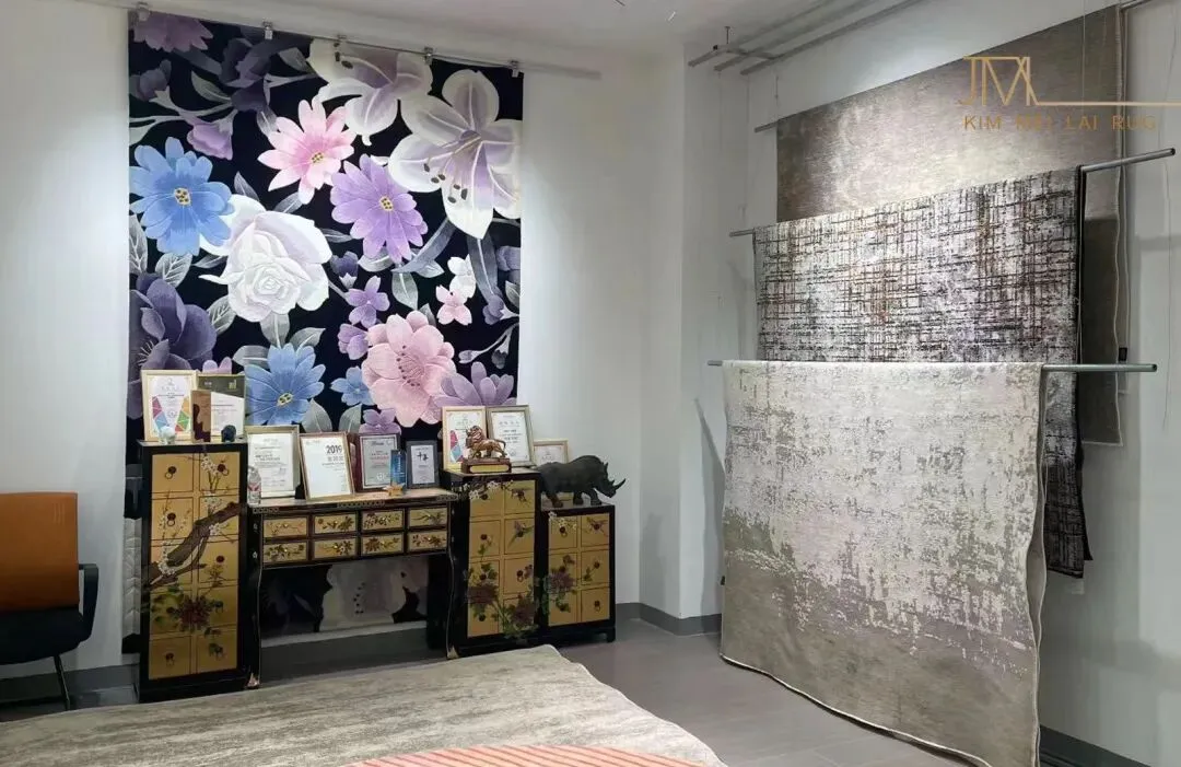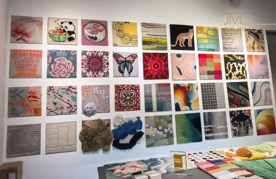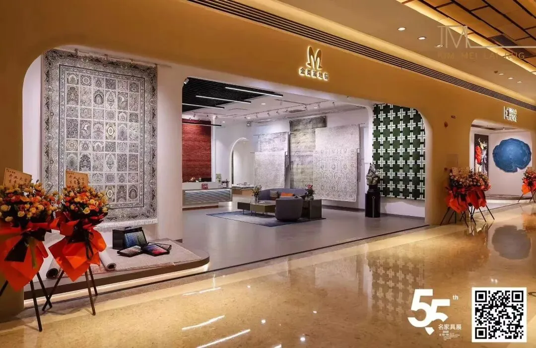 本次地毯展会于东莞世博园,4号馆的展位与9号馆的门店同时展示,汇聚了手工地毯与机织地毯两大品类,通过丰富的展品、沉浸式的展示空间与专业的交流互动,全面呈现了地毯行业的工艺创新与文化传承 手工地毯 工艺多样涵盖波斯风、中式传统、民族纹样等风格,通过手工枪刺、编织等技法,呈现出细腻的图案与立体感。例如,图中展示的深蓝色手工毯,以伊斯兰建筑拱门为构图核心,搭配花卉、几何纹样,色彩浓烈却和谐,针脚细密如织画;旁侧的红色手工毯则充满民族图腾感,纹样繁复且富有仪式感,机织地毯 除传统化纤材质外,机织毯引入“环保再生纤维”“抗菌防螨面料”等新材质, 手工+机织”互补共生:手工毯以“文化溢价+稀缺性”占据高端市场,机织毯以“性价比+快速迭代”覆盖大众消费与商业空间,