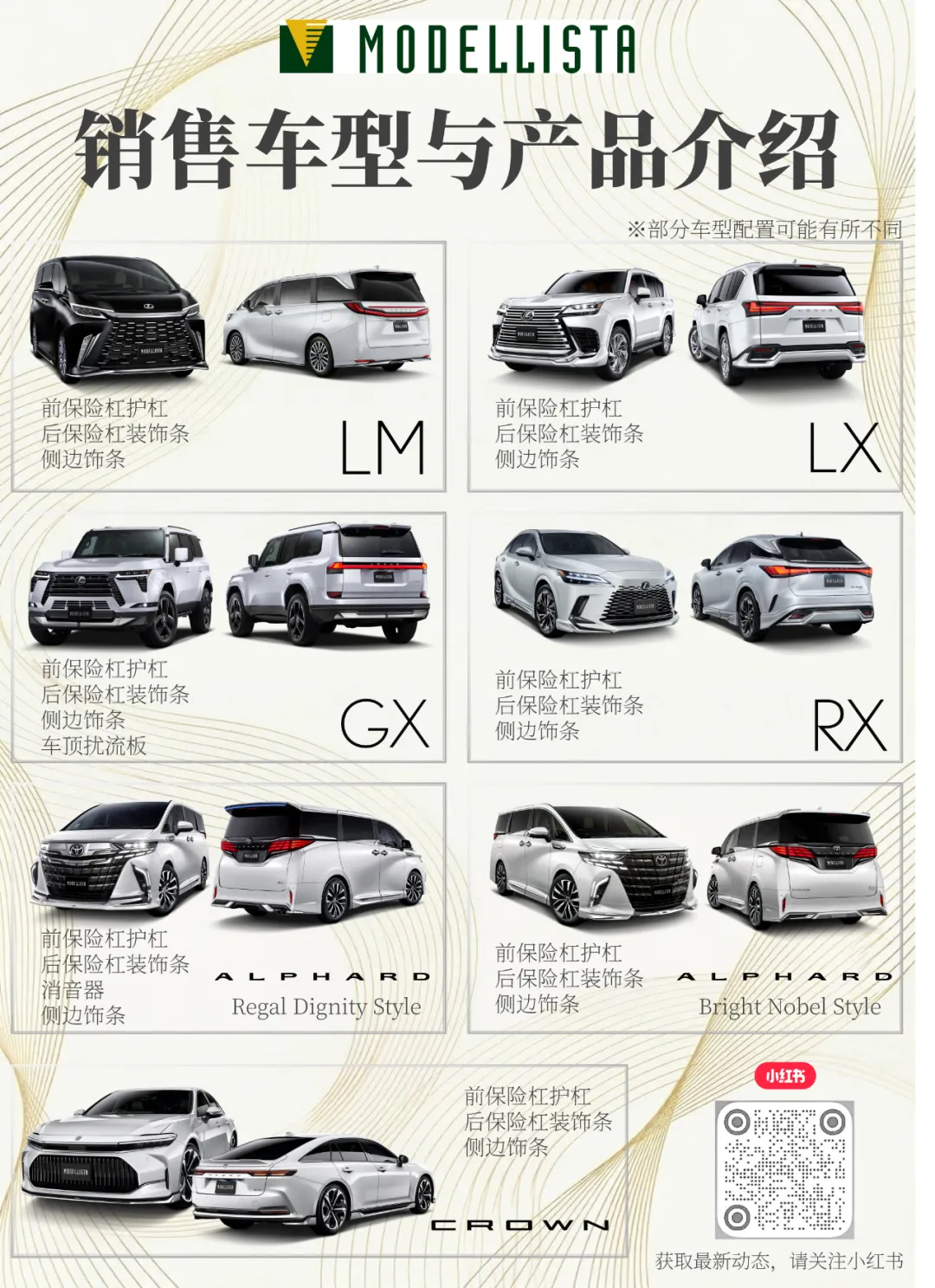 两台展车均升级了MODELLISTA全套外观包围套件,呈现品牌独特的设计风格。此外,展台还将介绍计划在中国市场推出的全新定制产品系列及对应车型。欢迎对丰田、雷克萨斯个性化升级感兴趣的行业伙伴及车主,莅临展位交流。