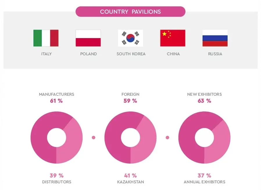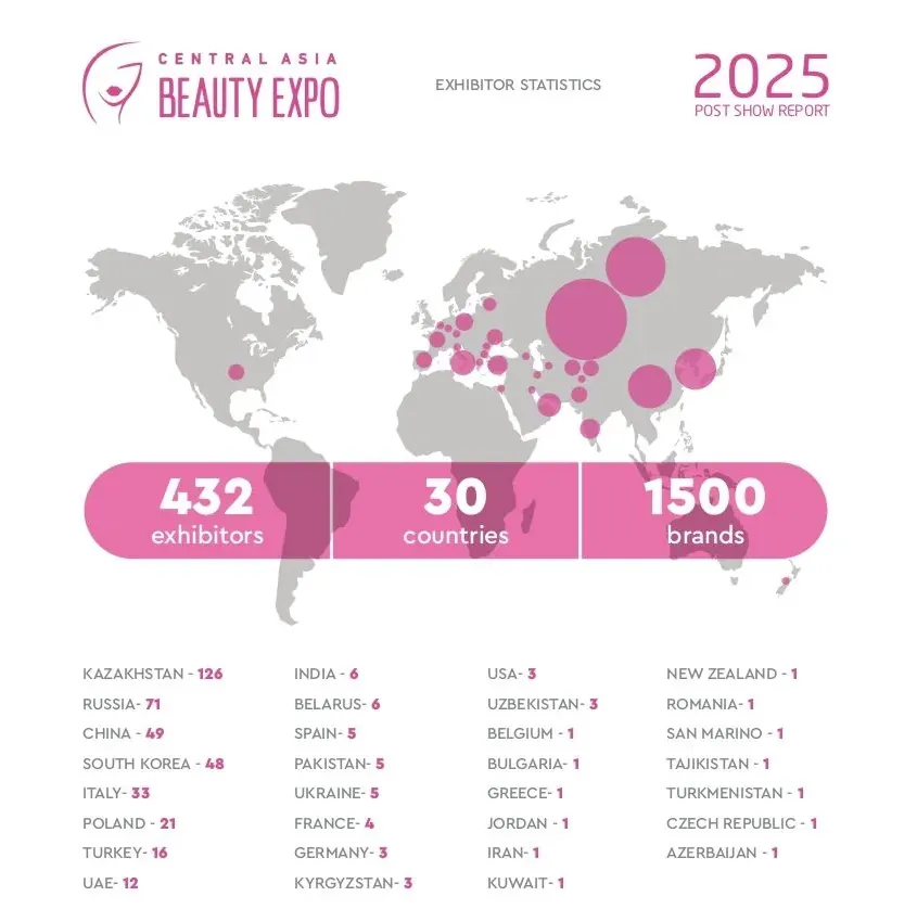 上届哈萨克斯坦美容展览会(Central Asia Beauty Expo)展览总面积达7000平方米,汇聚来自全球各地的500余家参展企业,涵盖中国、韩国、日本、新加坡、泰国、乌兹别克斯坦、中国香港、越南、土库曼斯坦等多个国家和地区,现场展示品牌数量超过1500个,吸引专业观众15000人次。
