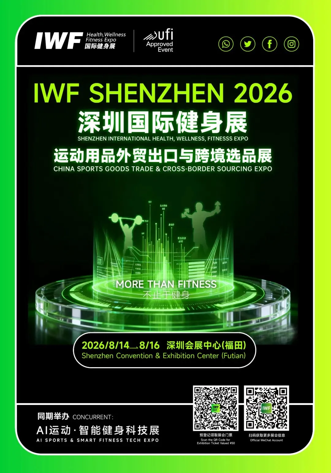 IWF2026深圳国际健身展的展位申请已全面开启,黄金展位优先预选,锁定核心资源,我们期待与全球运动健身行业伙伴共赴这场规模升级、价值升级的产业之约!详情请联系:15021637730(潘经理)