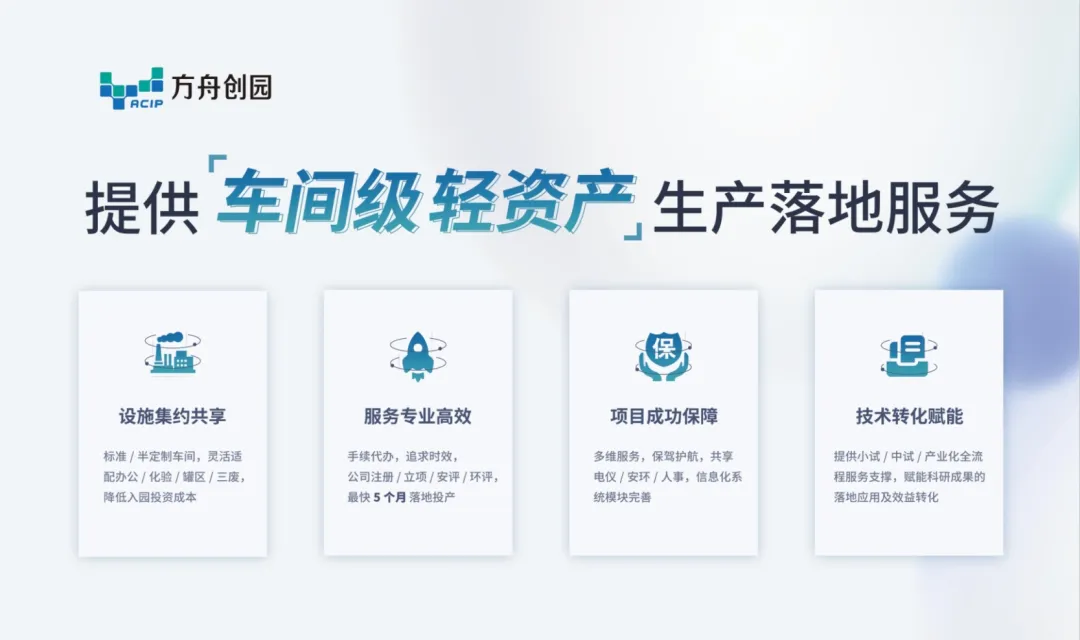 方舟创园定位为“化工新材料、专业化学品、电子化学品等领域的科技成果转化与产业化平台,与“聚焦科技成果转化的专业化孵化载体”高度契合。方舟通过构建“研发 + 中试 + 产业化” 全链条服务体系,解决精细化工领域科技成果落地难、转化慢的问题。其核心功能包括: