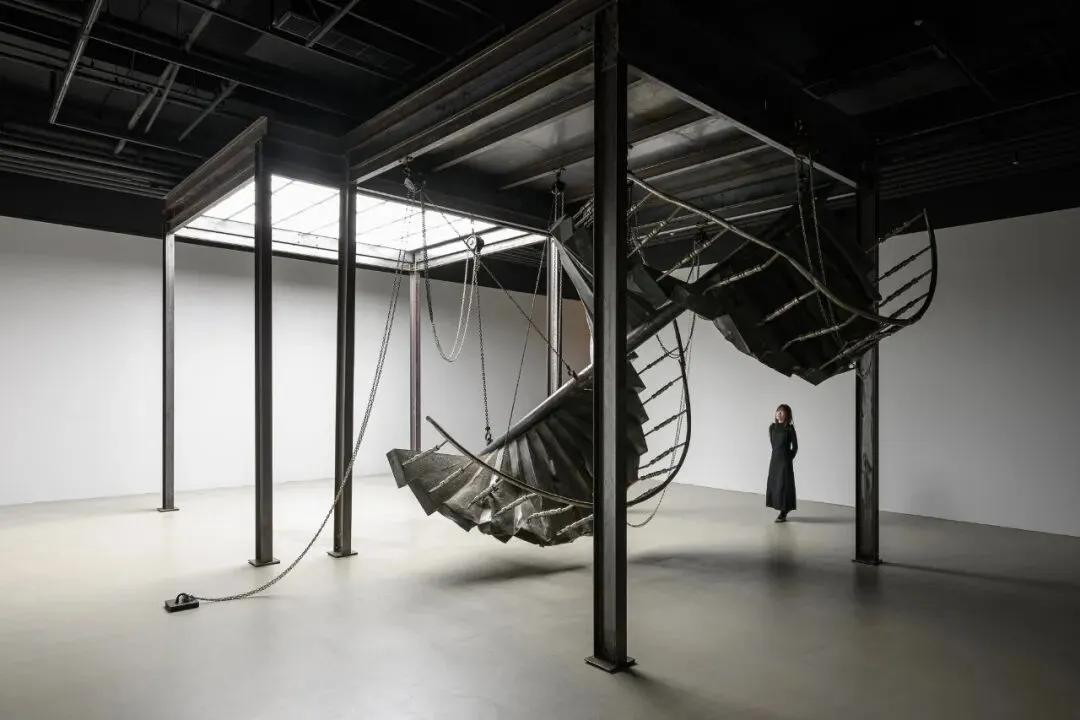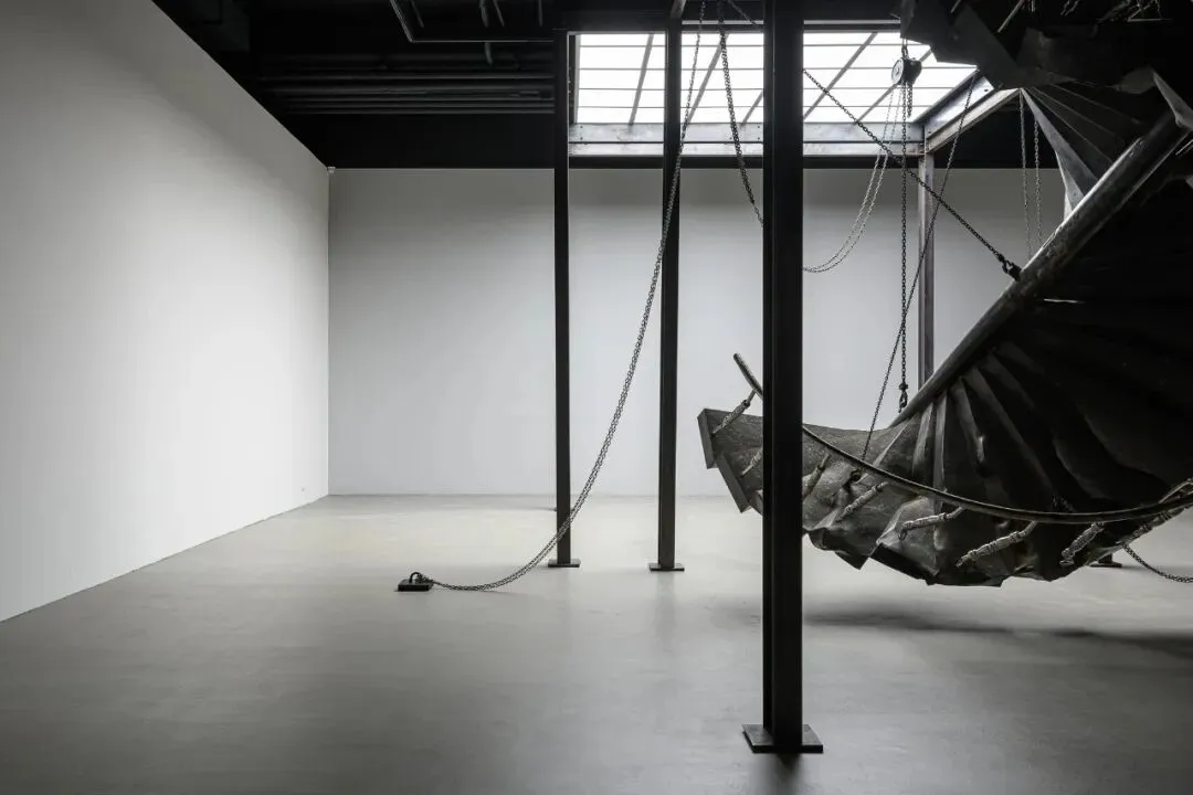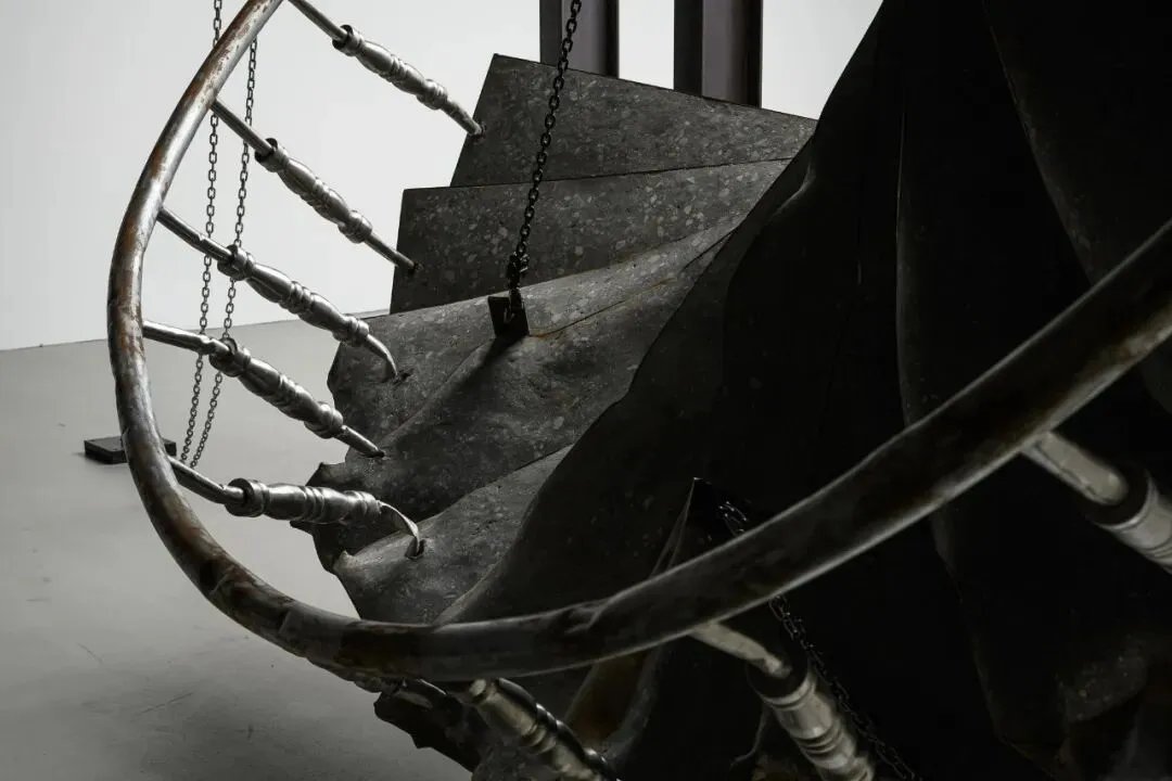 「柔韧之余—邱承宏个展」展场照,2026,TKG+,台北。王世邦摄影©TKG+在本次展览中,邱承宏以地震倒塌建筑中回收的钢筋、砖瓦与混凝土为基础材料,重构出旋转楼梯、柜体结构、与仿生灯具等雕塑形体,彷彿在一片崩坏的现实中寻索出一种异质却相互依存的秩序。作品〈失衡的螺旋〉中的螺旋造型取法自然界的费波那契数列与 DNA 双螺旋结构——那象徵生命生成与自我複製的基本法则。然而在此,螺旋不再稳定向上、循环不息,而是带着偏斜与裂缝的轨迹,显露出断裂、错置与再生的痕迹。每一阶梯面如同模具般承载来自不同灾难场域的残片,表面则以磨石子质地封存时间与磨损的层层叠积,像是将地质层理的运动视为一种雕塑生产的过程,凝结为一种看似建构、实则失衡的螺旋结构。