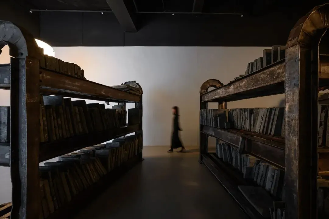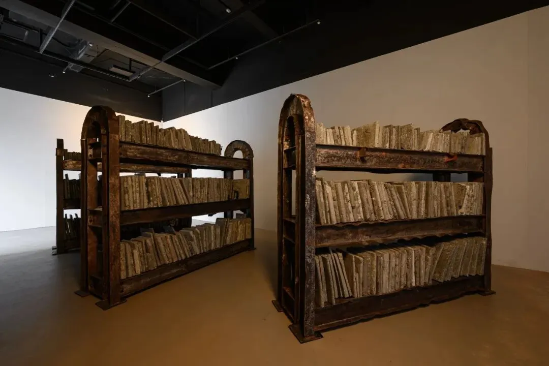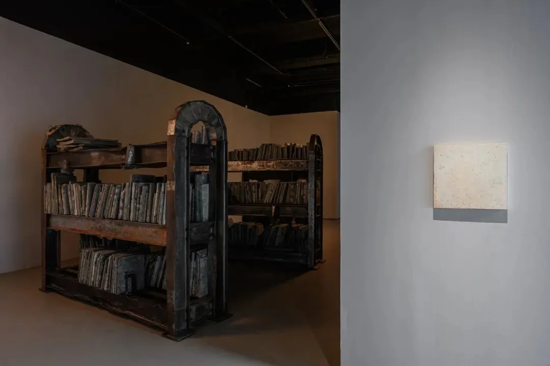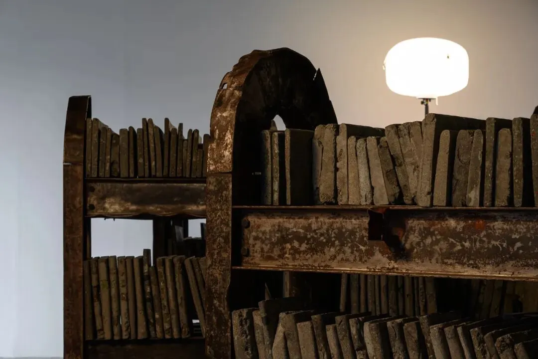 而在作品〈夜与灵魂〉中,艺术家将地震灾后遗留的扭曲钢筋与碎裂混凝土,转化为书柜与书本的雕塑结构,构筑出一座承载记忆的微型图书馆。工作灯投射出的微光在金属与碎片之间缓慢游移,使空间瀰漫着一层近乎潮湿的气息,彷彿某段被压复于瓦砾之下的时间重新渗出表层。邱承宏曾提及,这件作品揉合了他在高压状态下反复出现的梦魇意象,以及 0403 地震中倒塌建筑所留下的断壁残垣。艺术家自废弃场回收地震后遗留下的残骸,让扭曲的钢筋构成书柜的骨架,碎裂的混凝土经击碎、混合水泥后重新铸造成书的形体,使创伤、梦境与物质在此交叠为一种无法言说却持续凝视着观看者的存在。